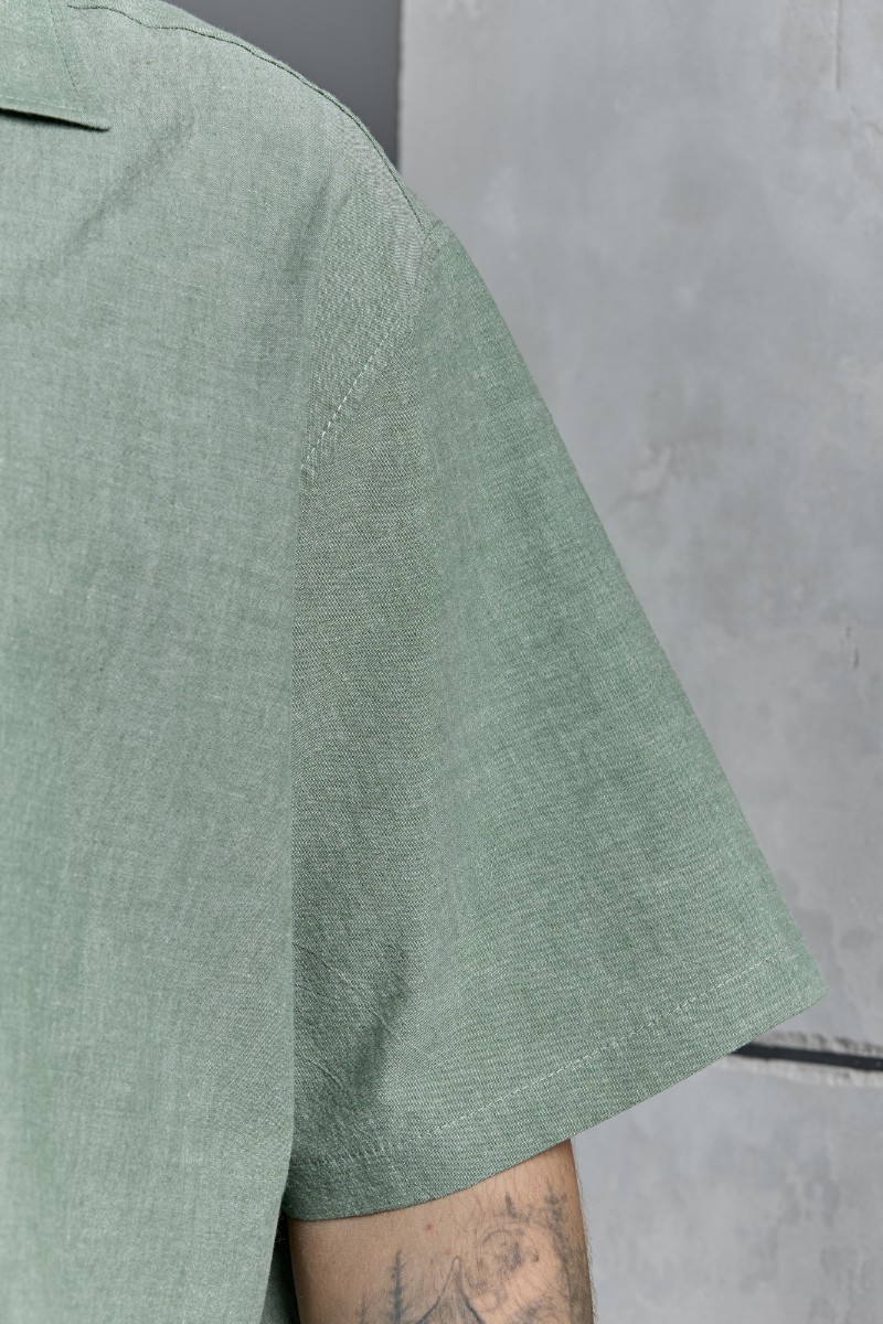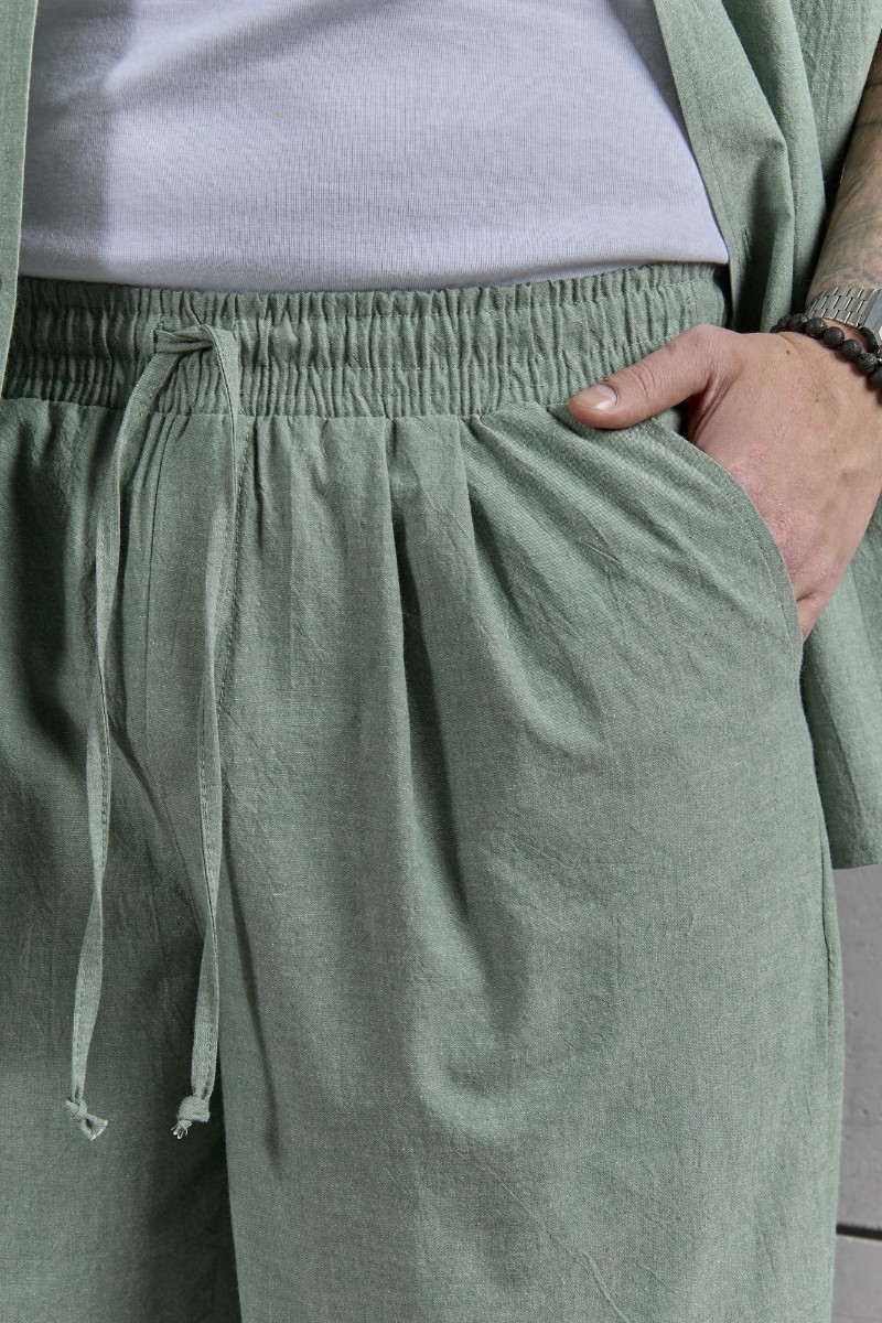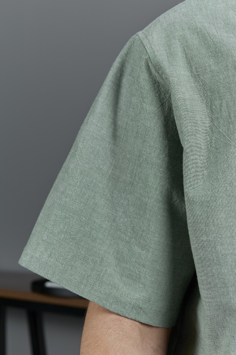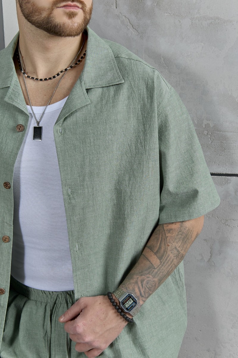 Представляем Вашему вниманию костюм мужской, состоящий их рубашки и шорт из гладкокрашеного фактурного полотна. Рубашка - с короткими втачными рукавами, стояче-отложным воротником и центральной бортовой застежкой на обметанные петли и пуговицы. Спинка - с притачной кокеткой. По плечевым швам, воротнику, кокетке и швам втачивания рукавов настрочены отделочные строчки. Нижние срезы изделия и рукавов обработаны подгибкой. Шорты - удлиненные, на притачном поясе с эластичной тесьмой внутри и карманами в боковых шва. Средний шов переда обработан с имитацией застежки "гульфик". Для регулирования степени прилегания изделия по талии предусмотрен шнурок вставленный в пояс через две обметанные петли. Нижние срезы обработаны подгибкой.