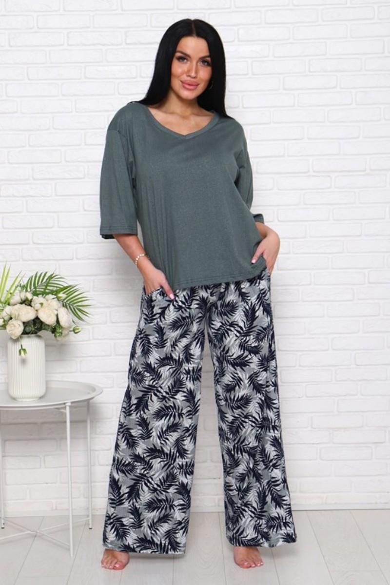 Костюм двойка женский "Джина-2" кулирка (последний размер) листья хаки-серый верх 52