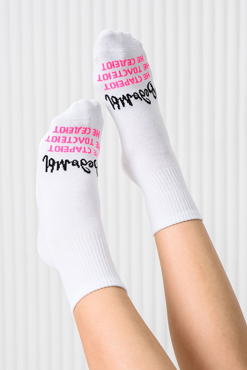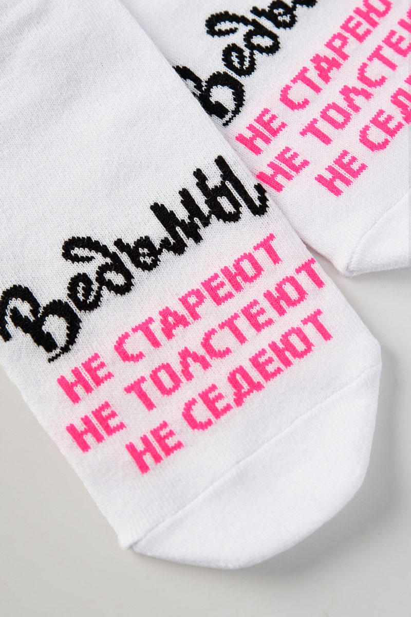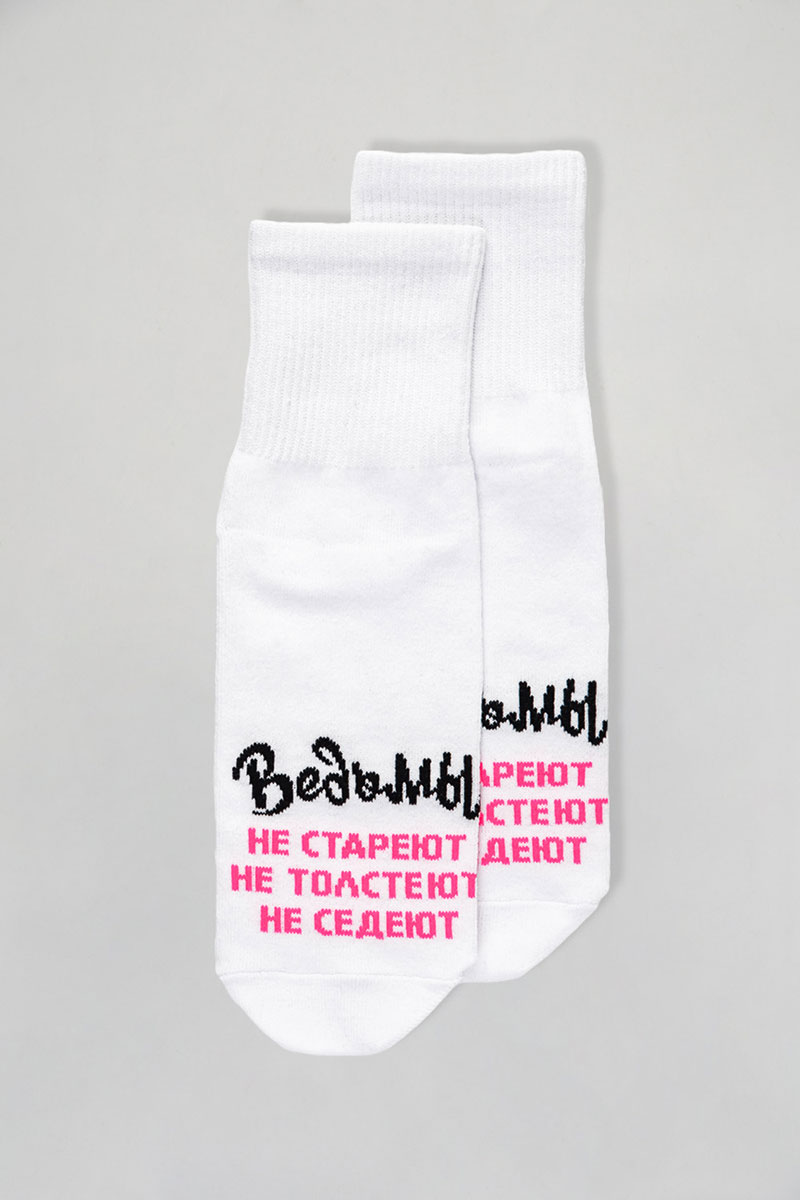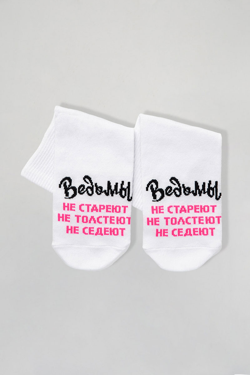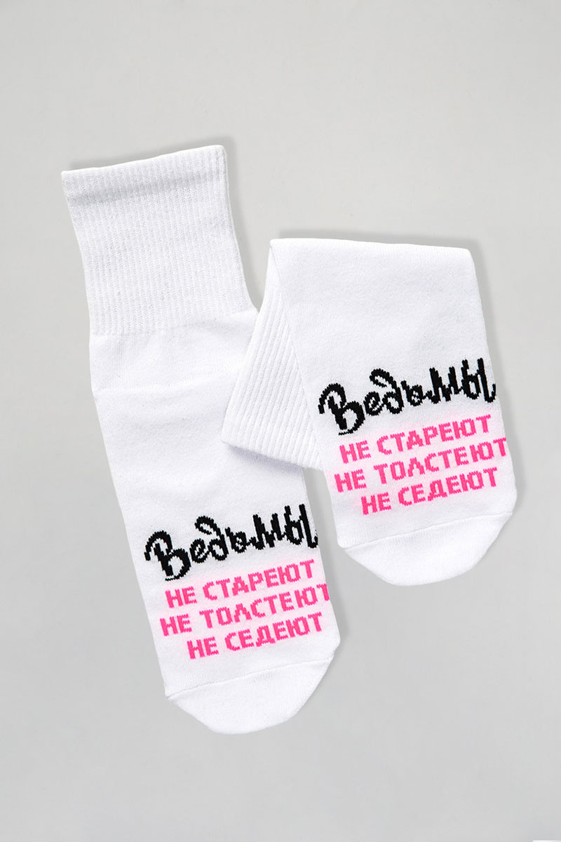 Представляем Вашему женские носки. Добавьте в свой образ чуточку магии и юмора с этими стильными носками! Белые носки с яркой надписью «Ведьмы не стареют, не толстеют, не седеют» созданы для тех, кто любит быть в центре внимания и всегда верит в маленькие чудеса. Мягкий и приятный к телу материал подарит комфорт на весь день, а оригинальный дизайн подчеркнёт вашу индивидуальность. Отличный подарок для себя или подруги, которая уверена: всё волшебство — в ней самой!