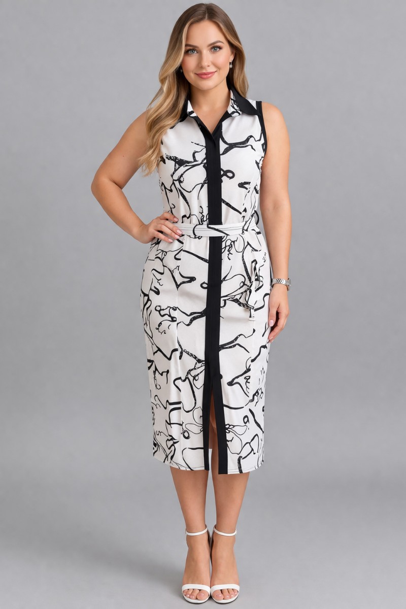 Представляем Вашему вниманию женственное платье без рукавов с принтом и контрастной отделкой. Приталенный силуэт подчеркивает фигуру, а аккуратный разрез спереди добавляет стиль и свободу движений. Подходит для любого повода — от деловых встреч до стильных выходов в свет. Комфорт и стиль в одном!
