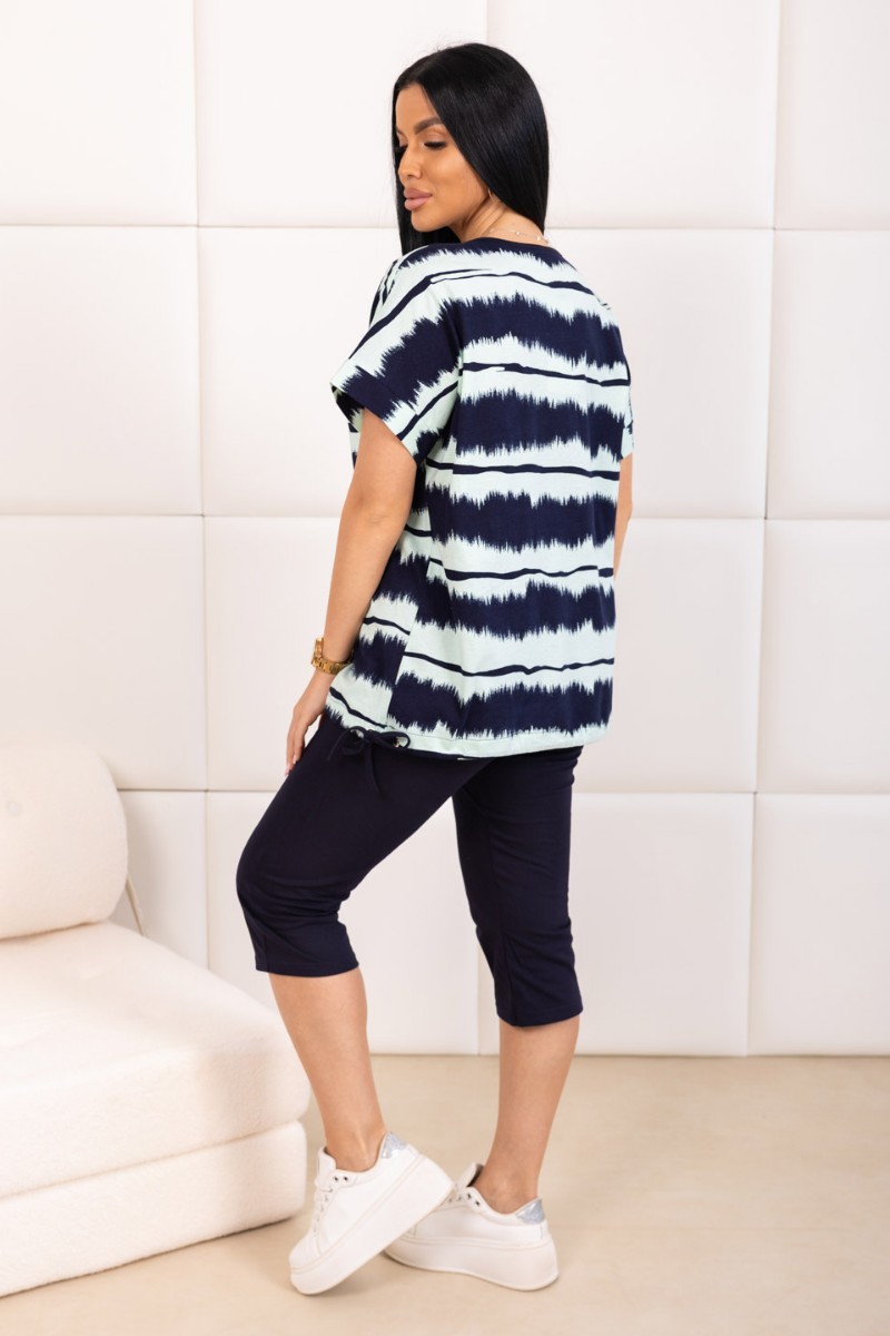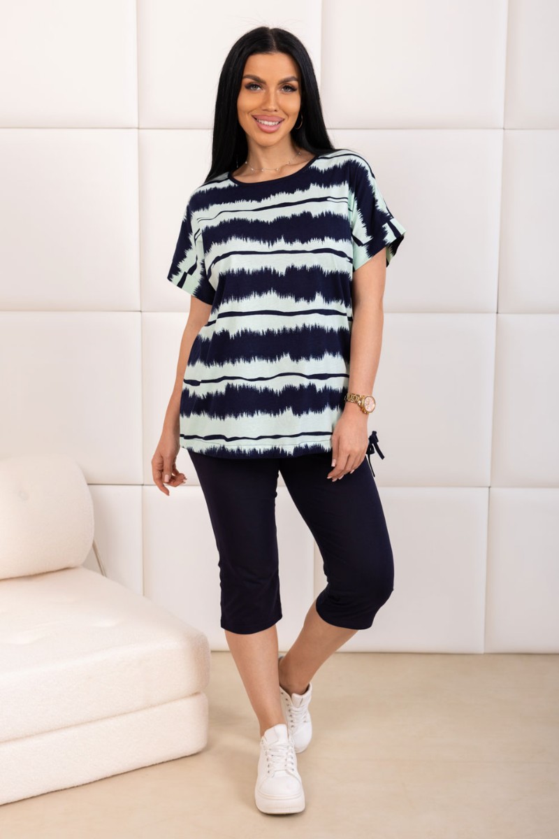 Представляем Вашему вниманию женский дачный костюм с бриджами. Футболка с О-образной горловиной, спущенной линией плеча и манжетой, по низу изделия кулиска. Бриджи на резинке, без карманов.