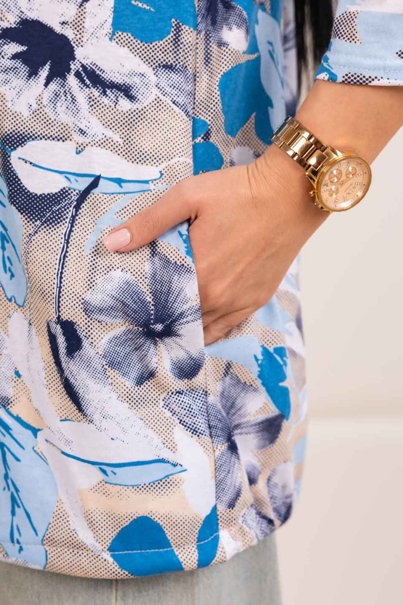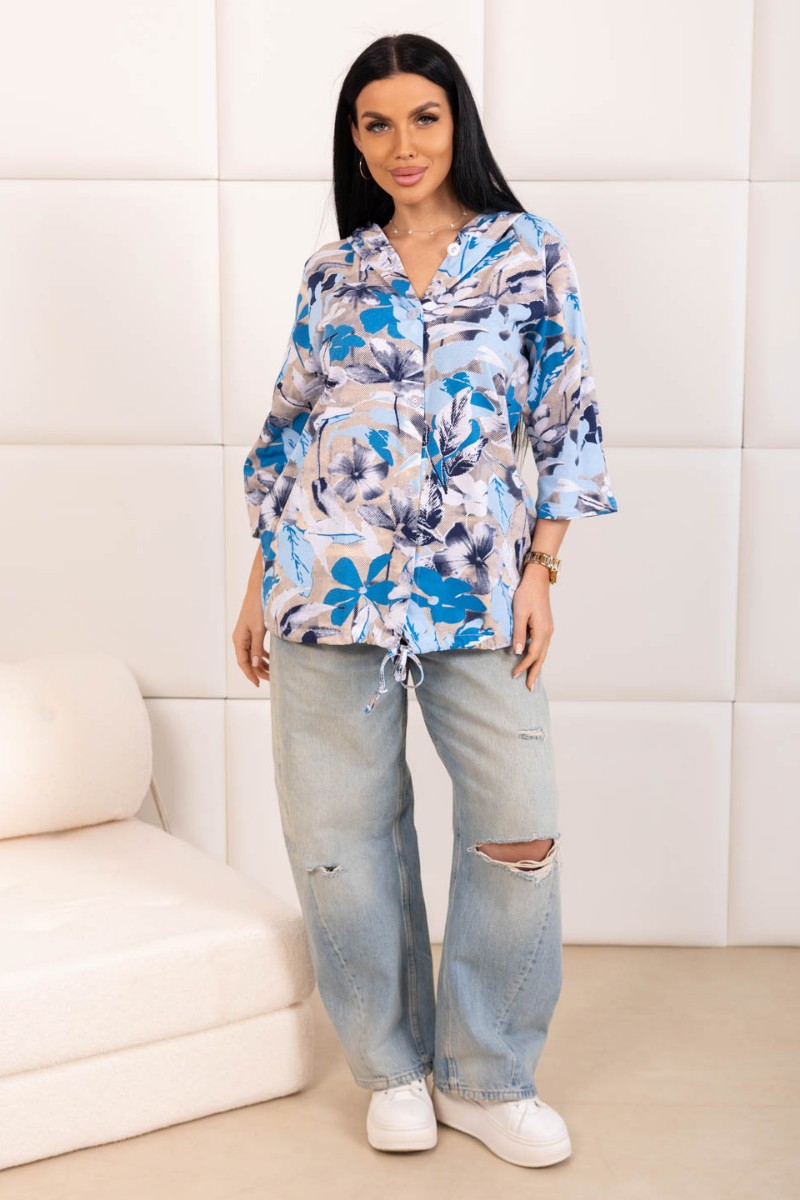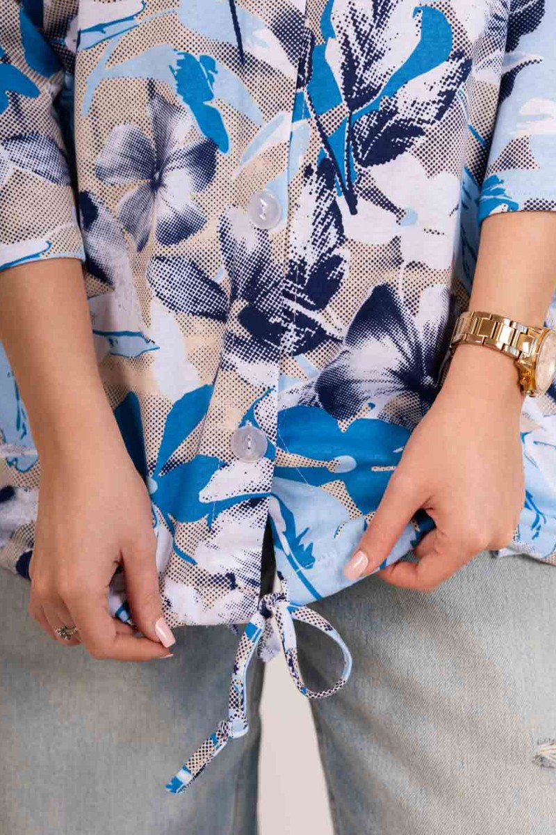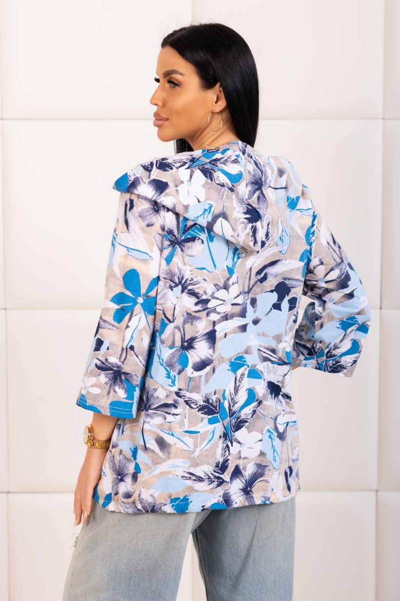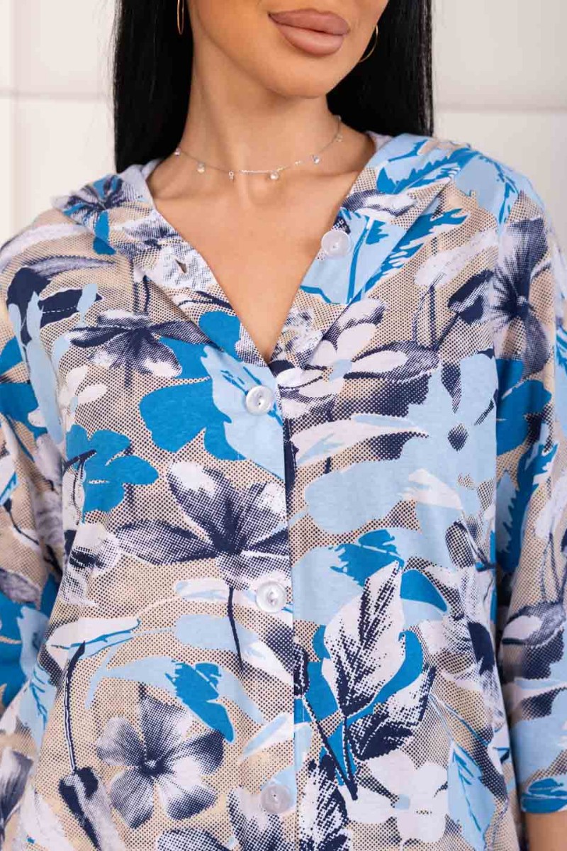 Представляем Вашему вниманию женскую рубашку с капюшоном, сшитую из 100% хлопка. Модель на пуговицах и кулиске, с рукавом 3/4. Туника выполнена из набивной кулирки турецкого качества.