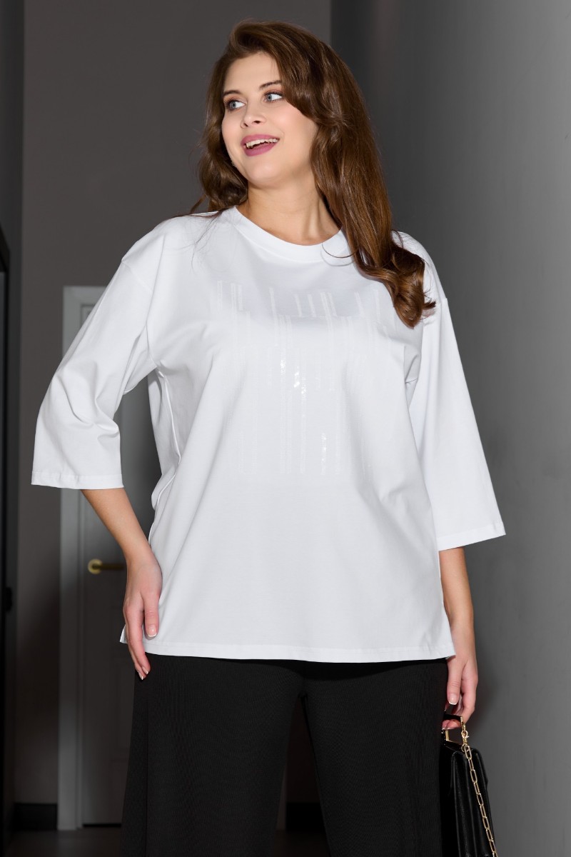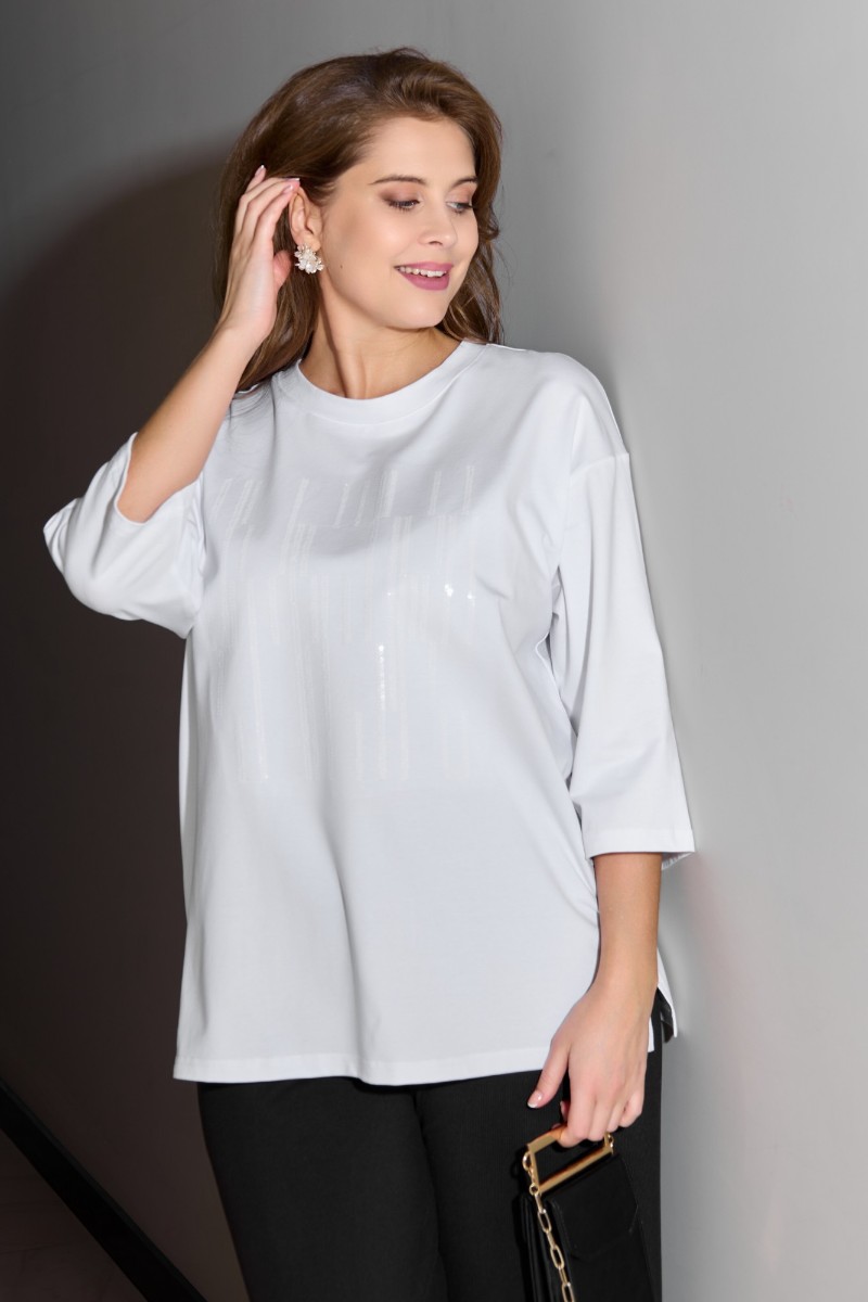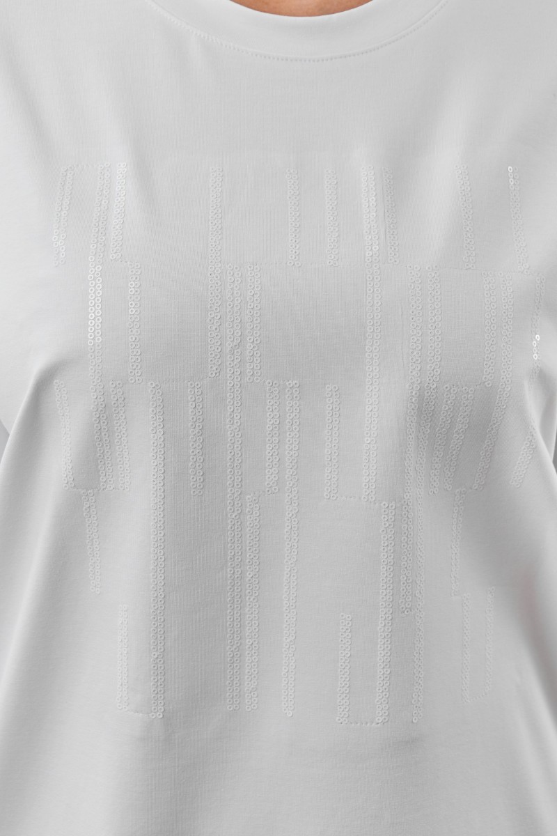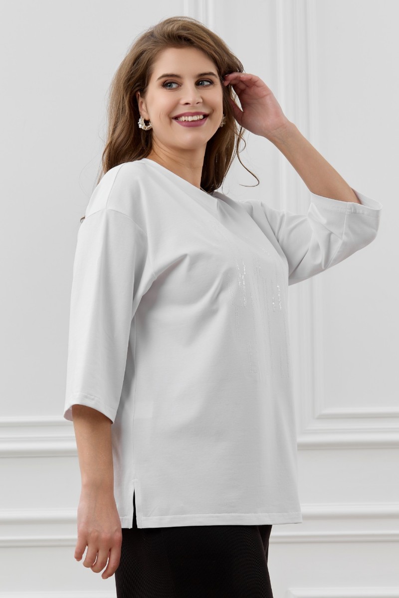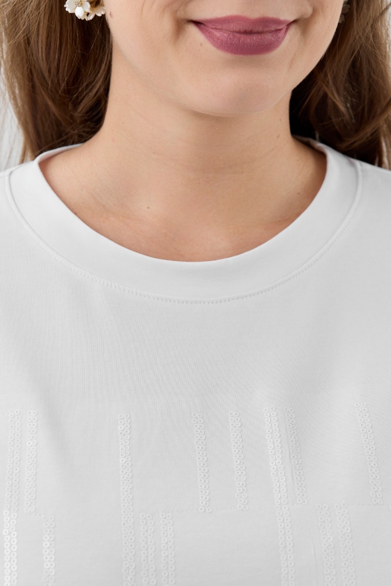 Представляем Вашему вниманию женскую футболку из гладкокрашенного трикотажного полотна «кулирка с лайкрой», свободного покроя, со спущенным плечом и втачными рукавами длиной до локтя, горловиной овальной формы, обработанной втачной планкой. По центру полочки выполнена вышивка «пайетками» в тон изделия. В нижней части боковых швов небольшие разрезы.