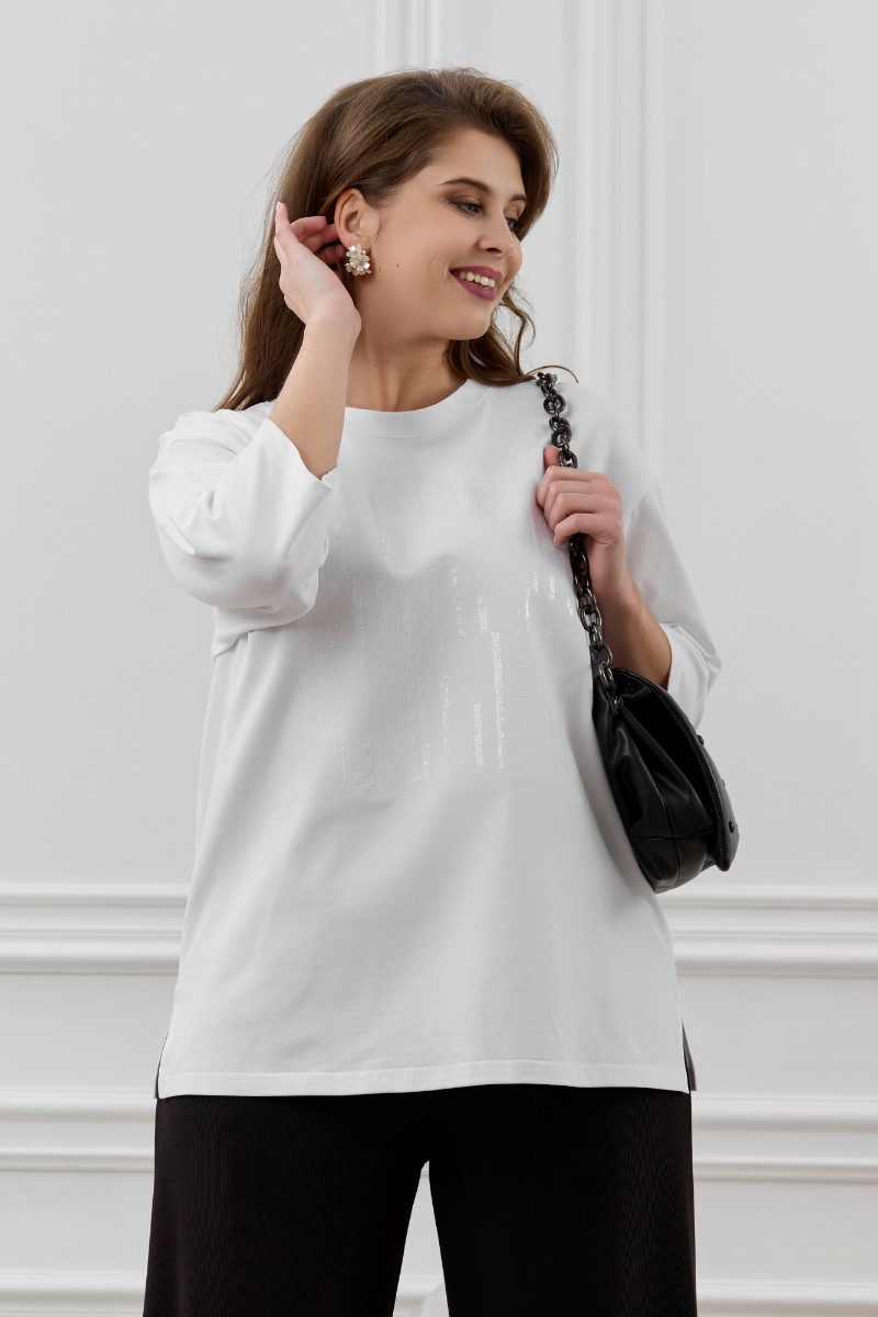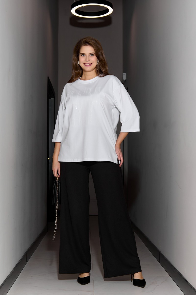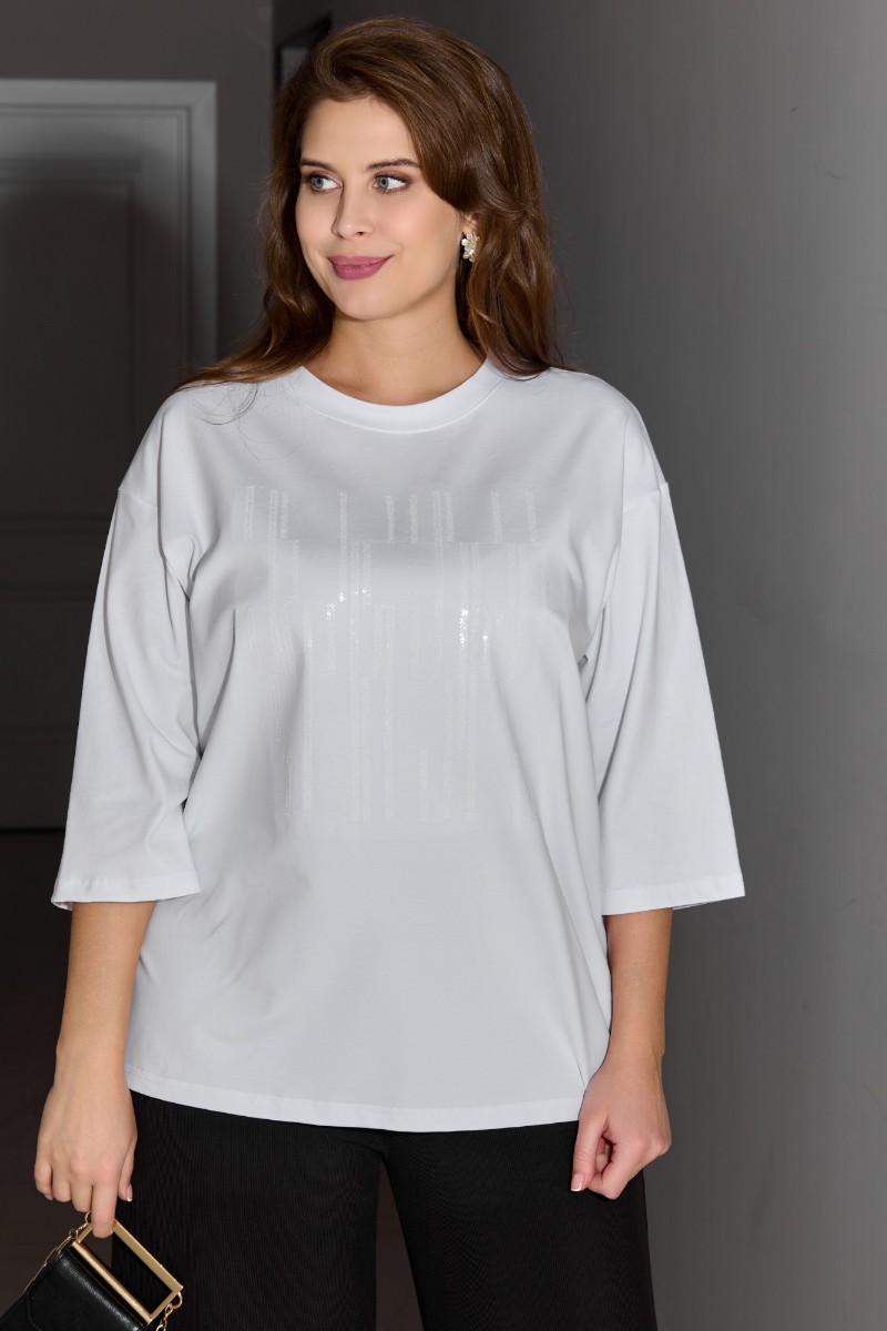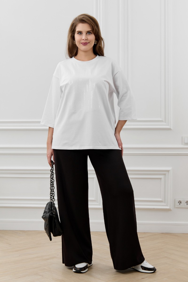 Представляем Вашему вниманию женскую футболку из гладкокрашенного трикотажного полотна «кулирка с лайкрой», свободного покроя, со спущенным плечом и втачными рукавами длиной до локтя, горловиной овальной формы, обработанной втачной планкой. По центру полочки выполнена вышивка «пайетками» в тон изделия. В нижней части боковых швов небольшие разрезы.