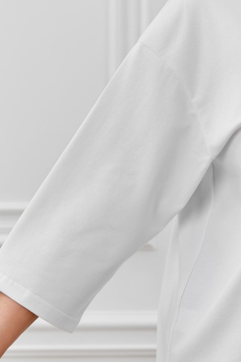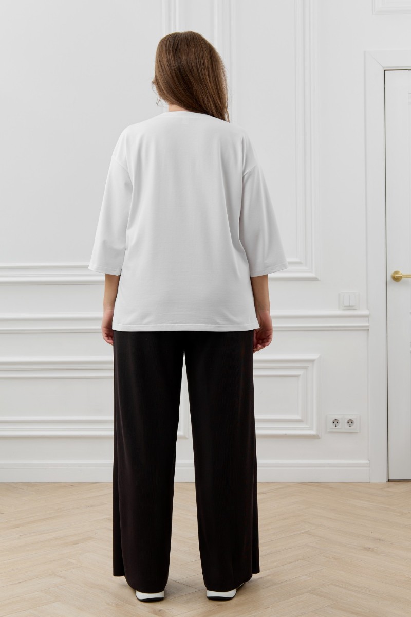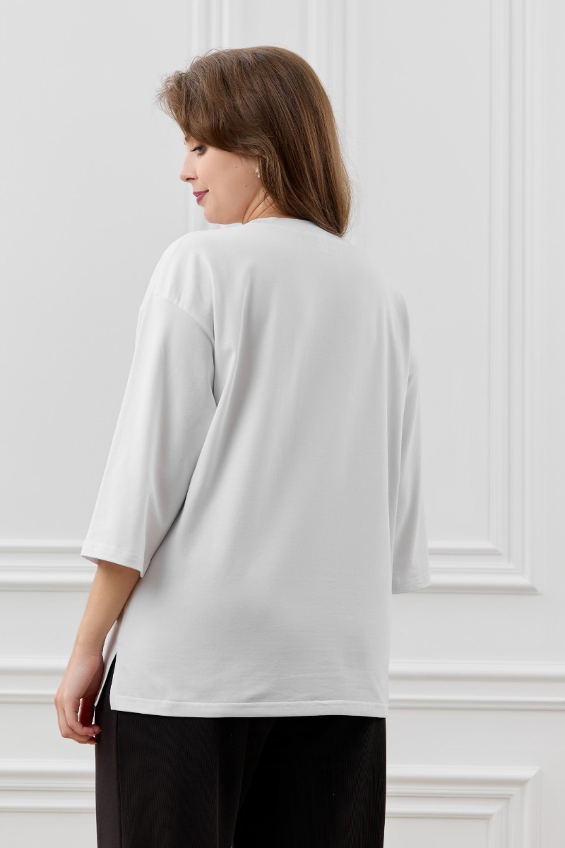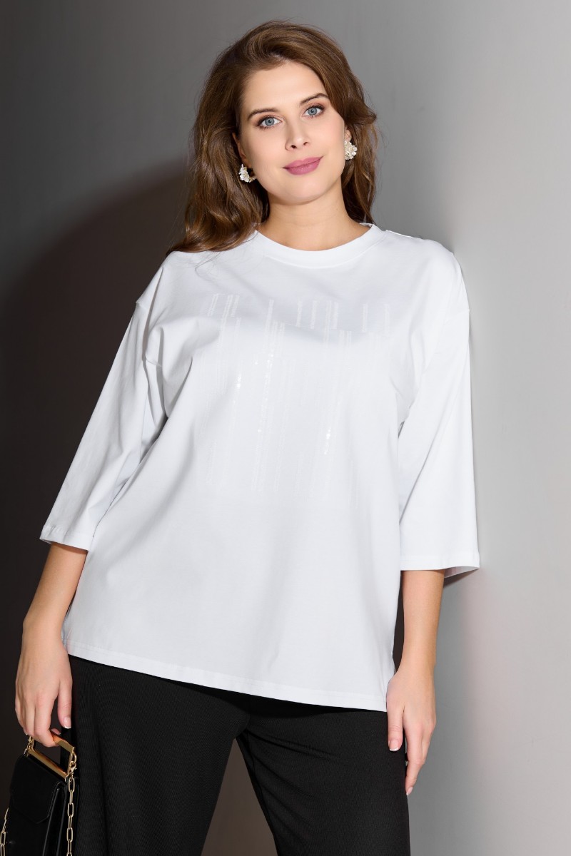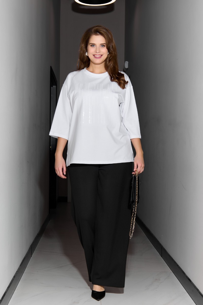 Представляем Вашему вниманию женскую футболку из гладкокрашенного трикотажного полотна «кулирка с лайкрой», свободного покроя, со спущенным плечом и втачными рукавами длиной до локтя, горловиной овальной формы, обработанной втачной планкой. По центру полочки выполнена вышивка «пайетками» в тон изделия. В нижней части боковых швов небольшие разрезы.