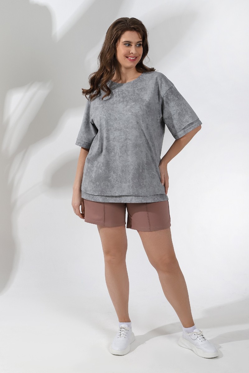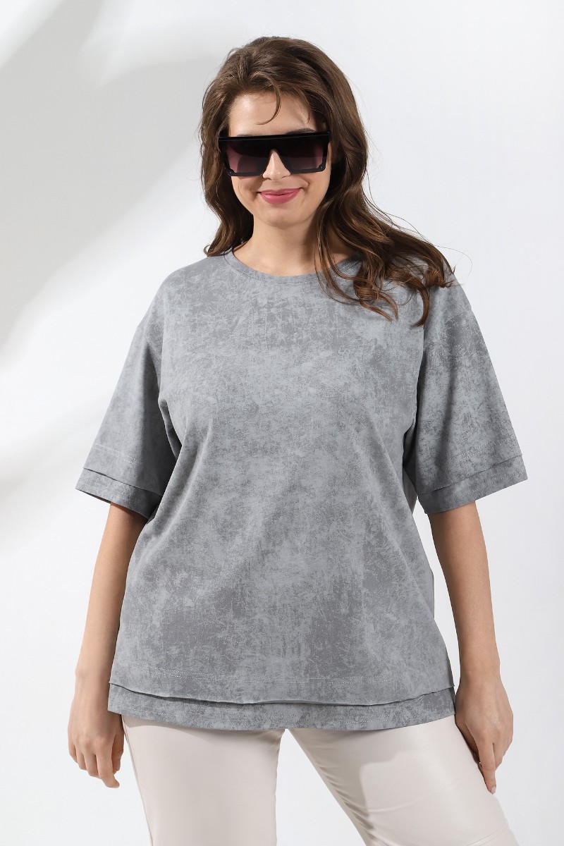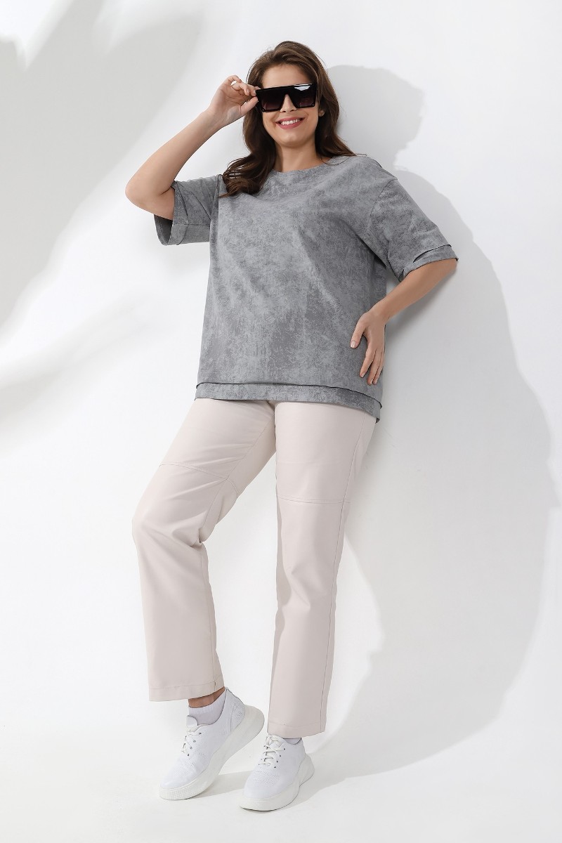 Представляем Вашему вниманию женскую футболку из гладкокрашеного трикотажного полотна «кулирка» с эффектом «варенки», свободного покроя, горловиной овальной формы, обработанной притачной планкой. Низ рукавов и изделия состоит из двух частей, одна из которых с необработанным краем, другая с подгибкой и соединенных между собой накладным швом.