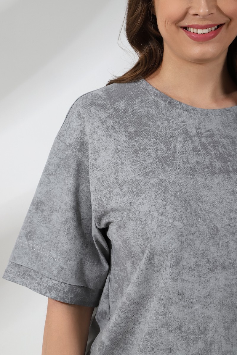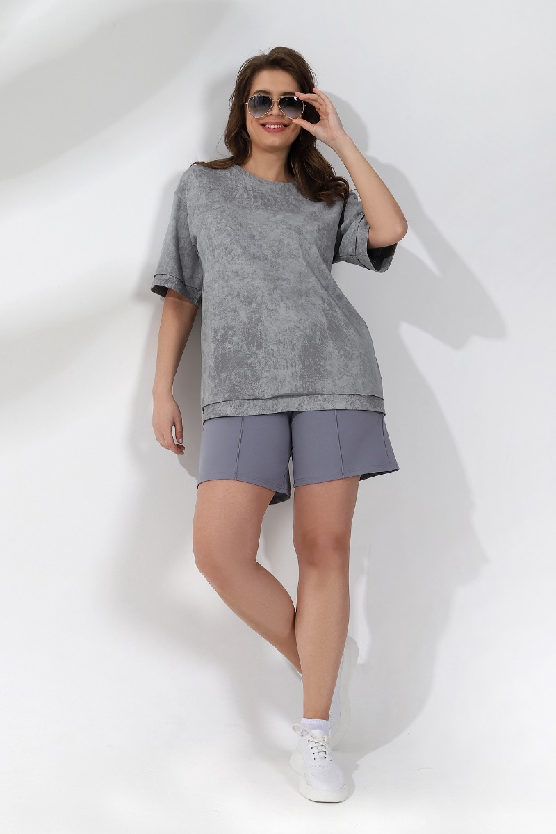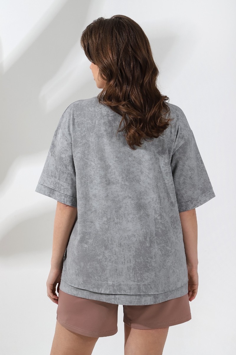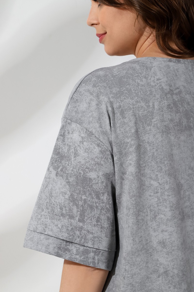 Представляем Вашему вниманию женскую футболку из гладкокрашеного трикотажного полотна «кулирка» с эффектом «варенки», свободного покроя, горловиной овальной формы, обработанной притачной планкой. Низ рукавов и изделия состоит из двух частей, одна из которых с необработанным краем, другая с подгибкой и соединенных между собой накладным швом.