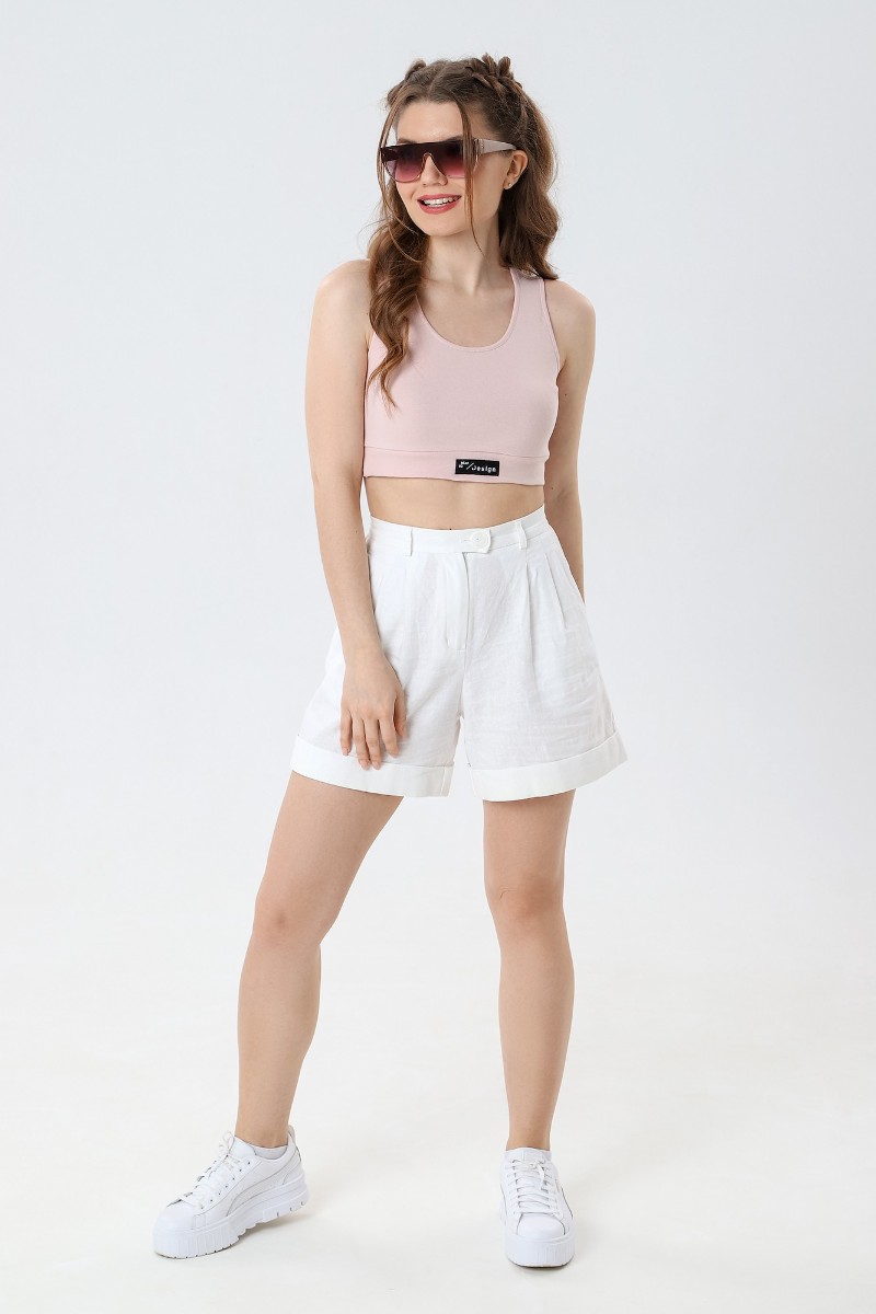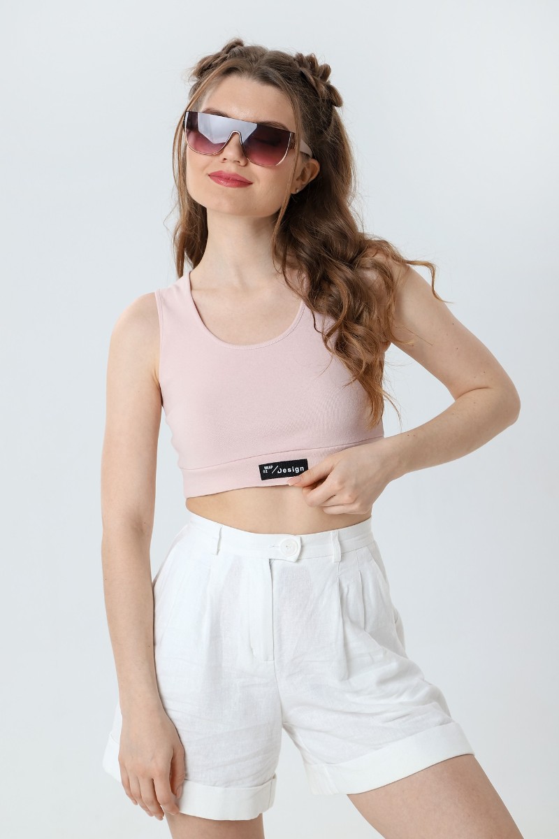 Представляем Вашему вниманию кроп-топ из полотна «рибана» без рукавов, с горловиной овальной формы, обработанной окантовкой из основного материала и притачным поясом по низу. В центре пояса настрочен декоративный элемент.