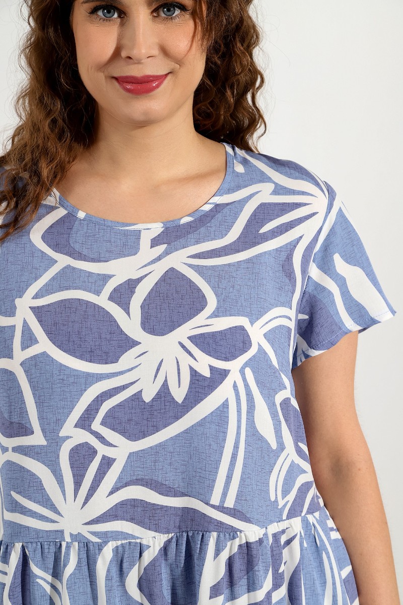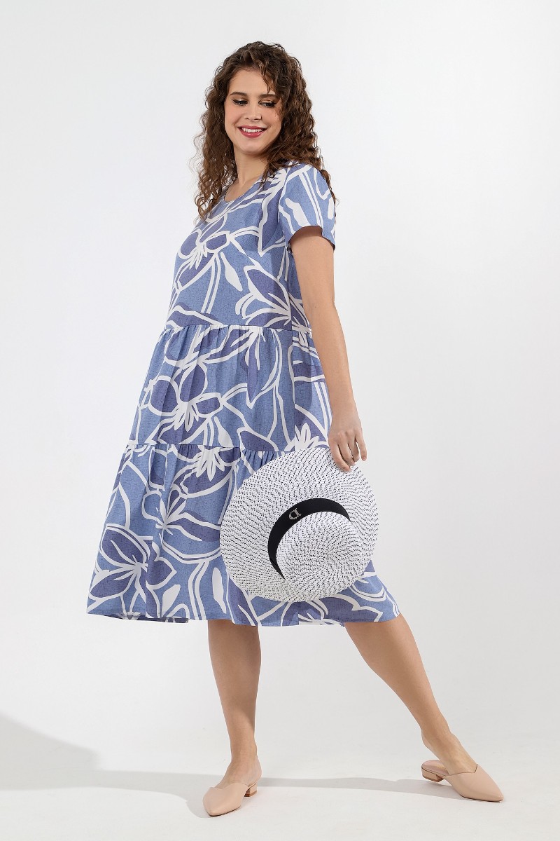 Представляем Вашему вниманию платье из плательной штапельной ткани с набивным рисунком, свободного покроя, отрезное по линии талии, с короткими втачными рукавами и горловиной овальной формы, обработанной обтачкой. Полочка – с вытачками в области груди. Юбка – из двух ярусов, каждый из которых присборен по шву соединения с верхней деталью.