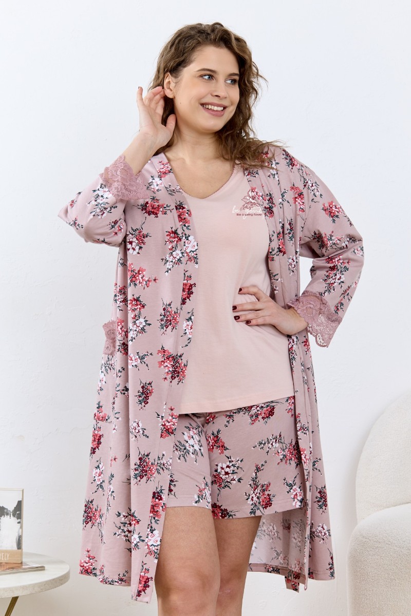 Представляем Вашему вниманию женскую пижаму из трикотажного полотна «кулирка» в комбинации двух видов: гладкокрашеного и с набивным рисунком, состоящая из футболки и шорт. Футболка – из гладкокрашеного полотна, с короткими цельнокроеными рукавами, горловиной V-образной формы. Низ рукавов и горловина обработаны декоративной строчкой «кроше», на полочке печать, выполненная в технике «шелкографии».Шорты – из полотна с набивным рисунком, удлиненные, свободного покроя, с эластичной тесьмой по талии.