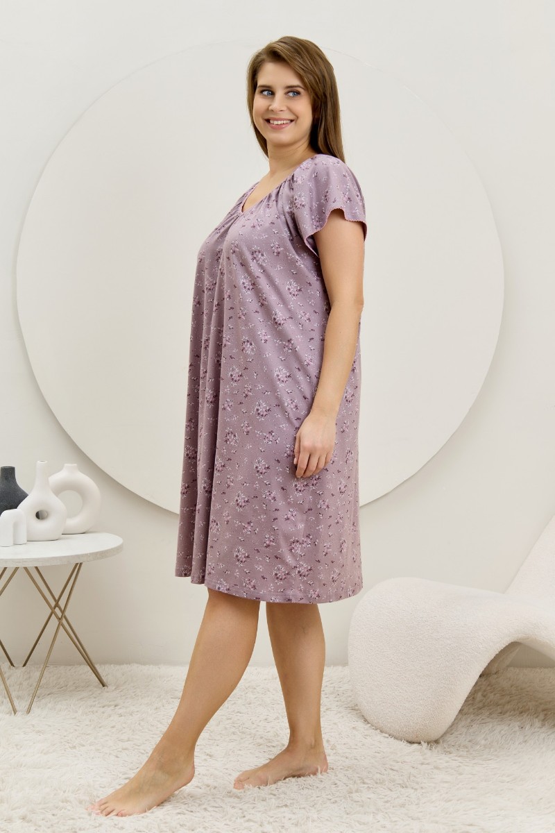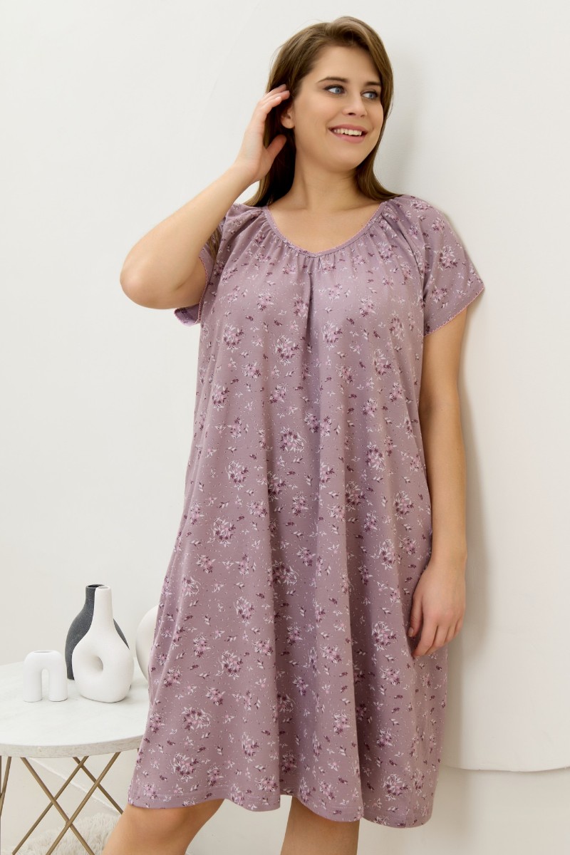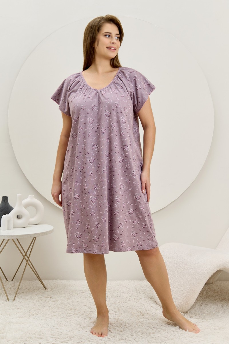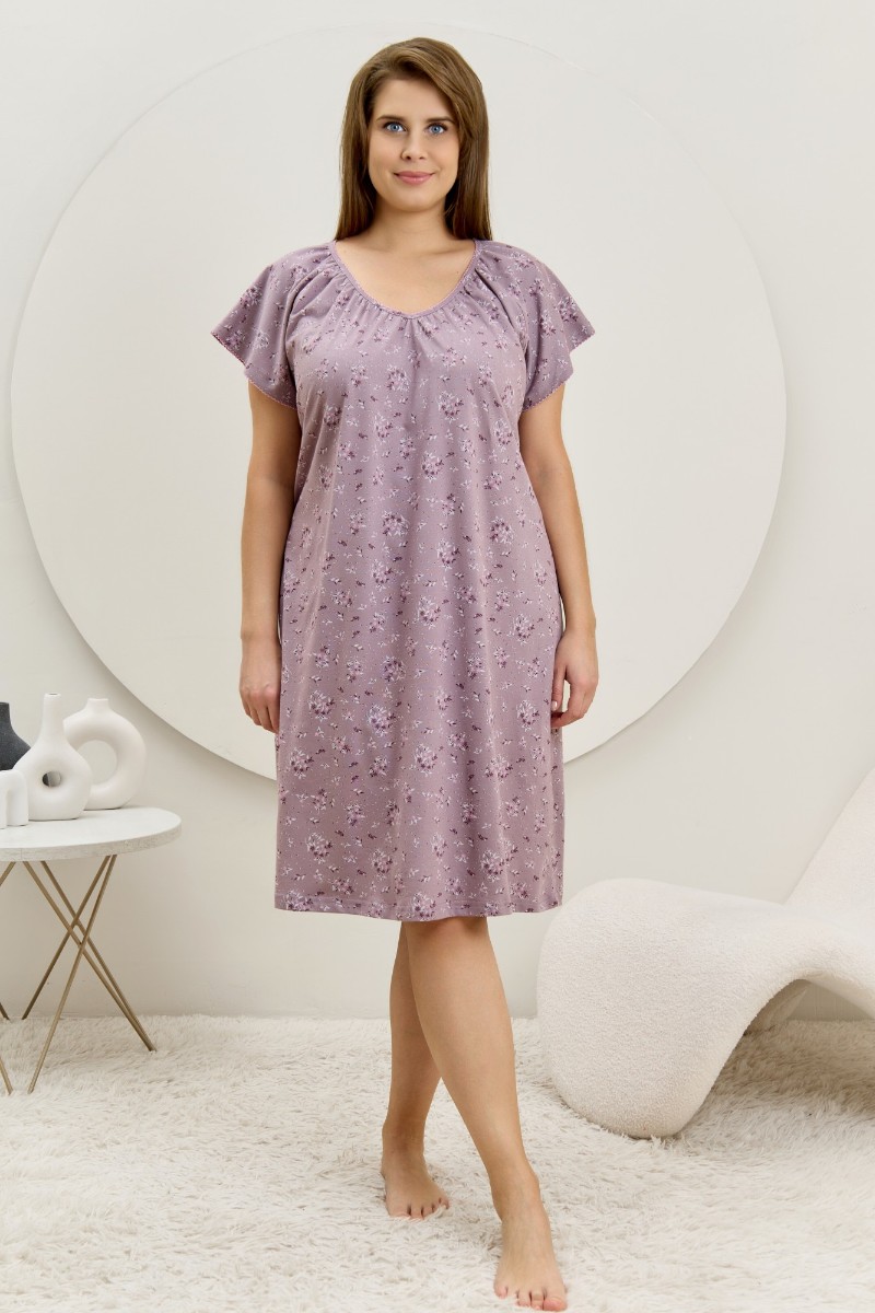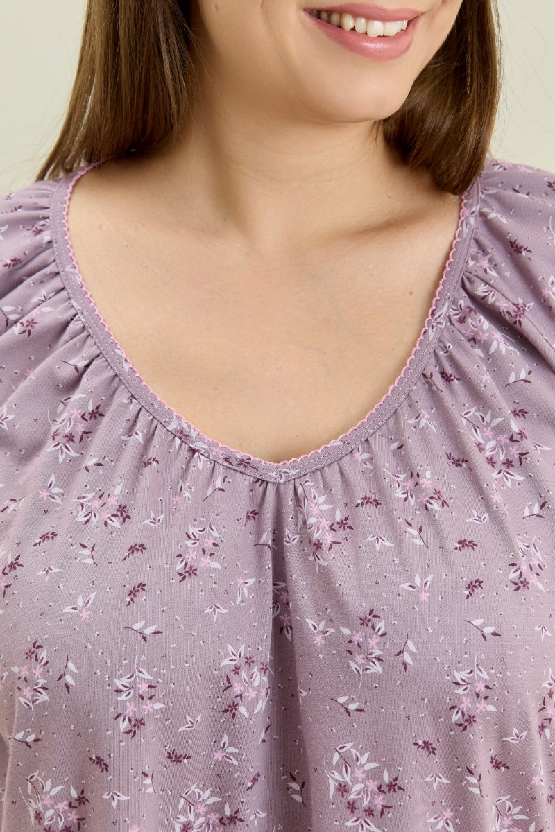 Представляем Вашему вниманию женскую сорочку из трикотажного полотна «кулирка» с набивным рисунком свободного покроя, с короткими втачными рукавами покроя «реглан». Углубленная горловина V- образной формы, собрана по краю на сборку и окантована основным материалом. Низ изделия и нижние срезы рукавов обработаны узким обметочным швом нитками в тон изделия.