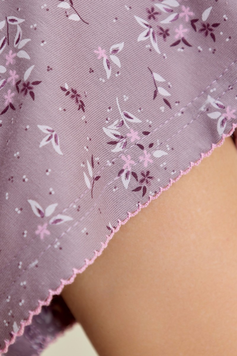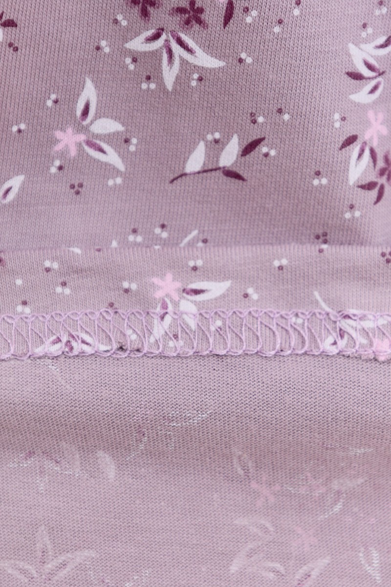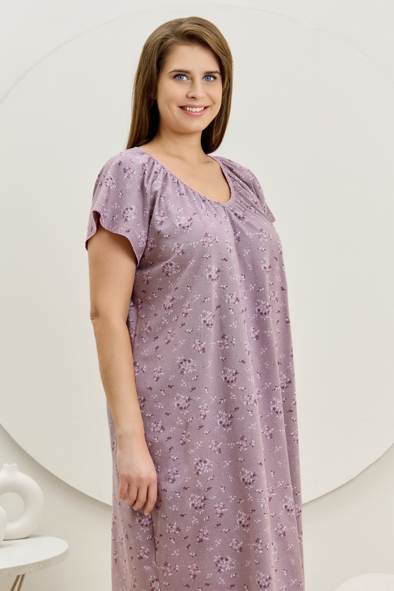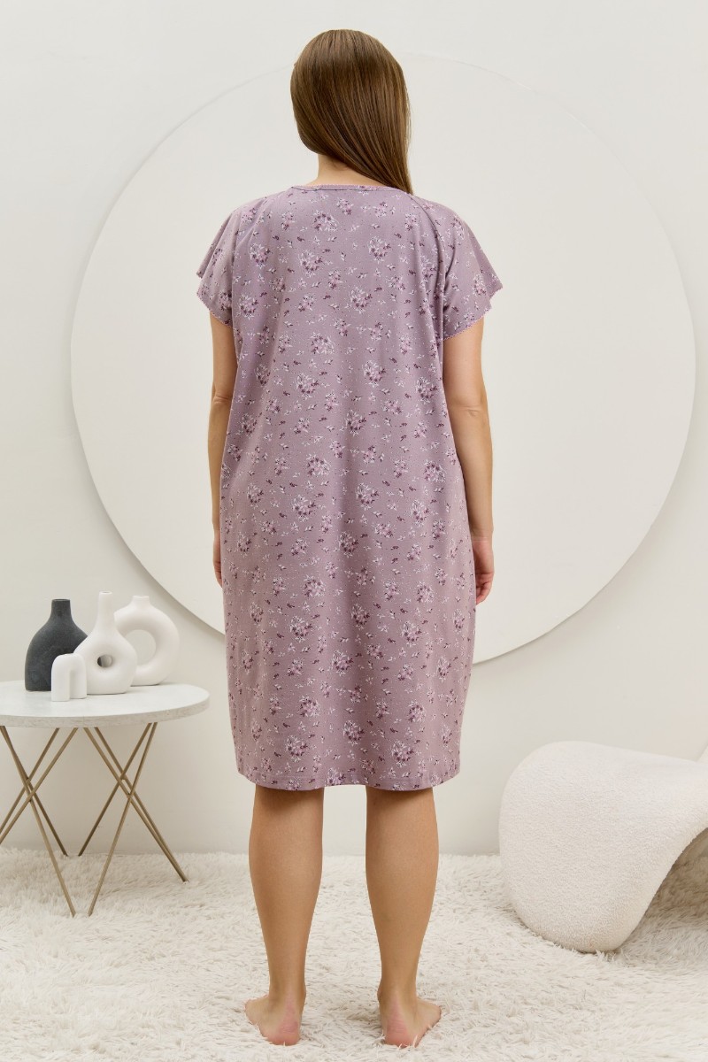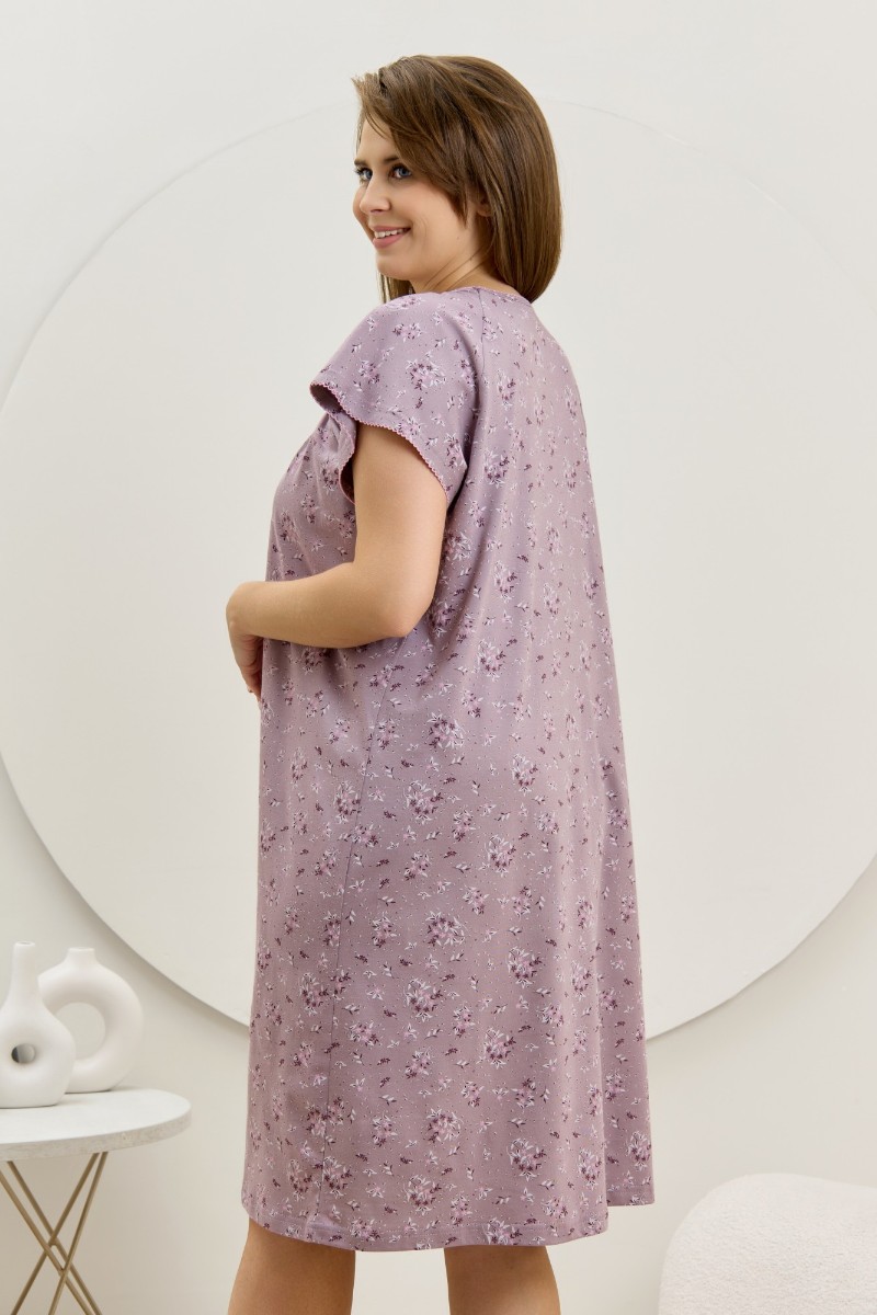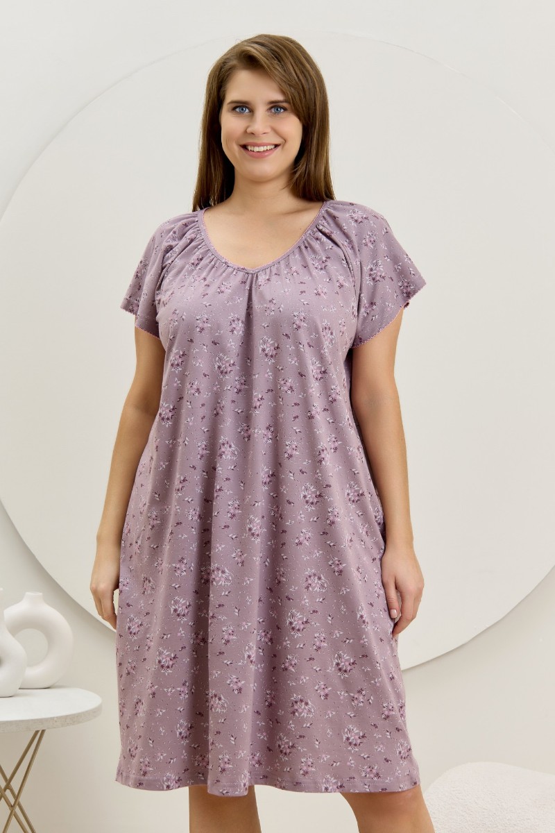 Представляем Вашему вниманию женскую сорочку из трикотажного полотна «кулирка» с набивным рисунком свободного покроя, с короткими втачными рукавами покроя «реглан». Углубленная горловина V- образной формы, собрана по краю на сборку и окантована основным материалом. Низ изделия и нижние срезы рукавов обработаны узким обметочным швом нитками в тон изделия.