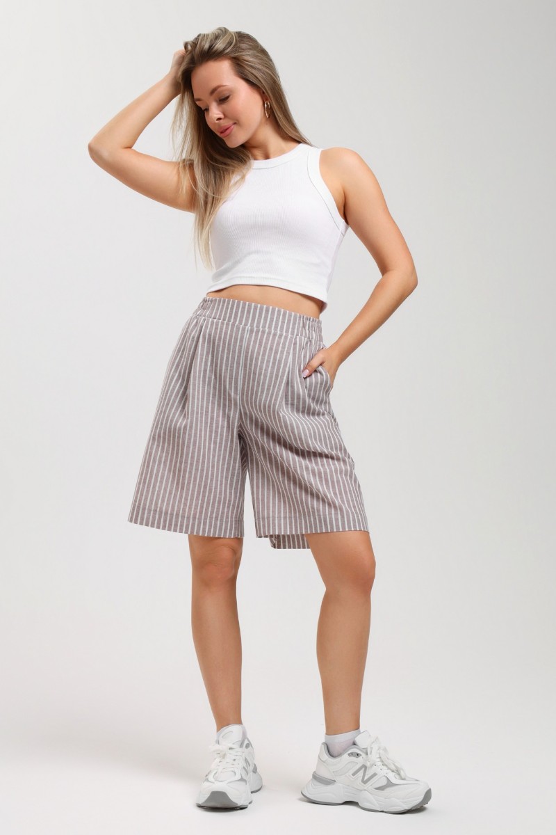 Представляем Вашему вниманию свободные женские шорты с карманами в боковых швах, с двумя заложенными складками пот алии, на притачном поясе с эластичной тесьмой внутри. Средний шов передних половин обработан имитацией «гульфика».
