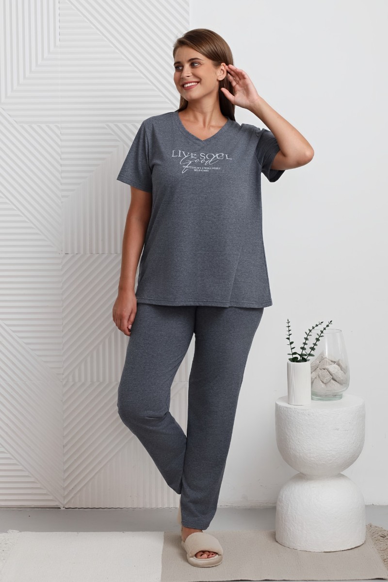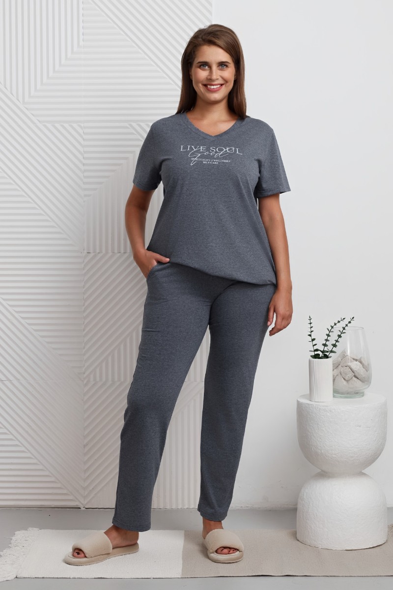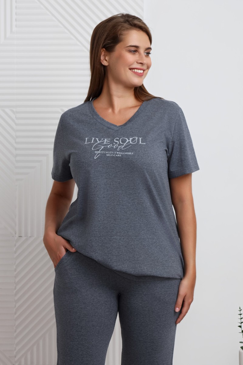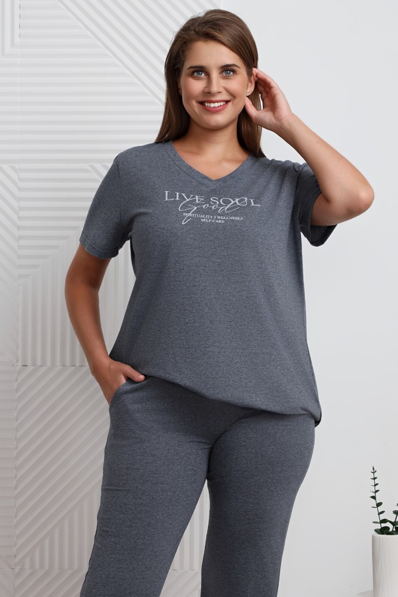 Представляем Вашему вниманию костюм женский из трикотажного гладкокрашенного меланжированого полотна «кулирка», состоящий из футболки и брюк.Футболка - классического покроя, с короткими втачными рукавами, горловиной V- образной формы и принтом на полочке, выполненным в технике «шелкографии». Горловина обработана втачной планкой из основного материала.Брюки - свободного покроя, с карманами в боковых швах, на притачном поясе с эластичной тесьмой внутри.