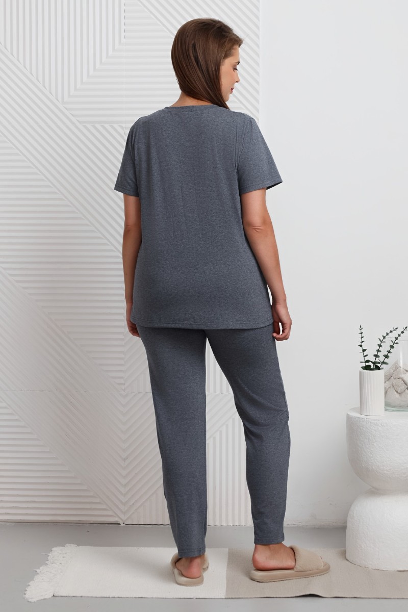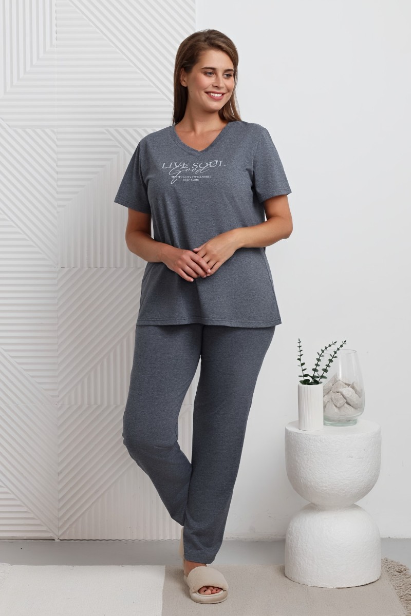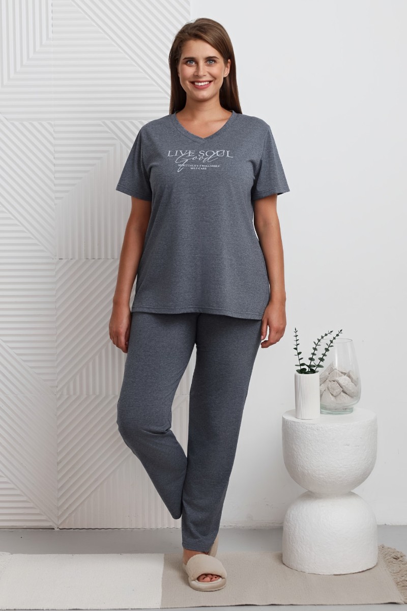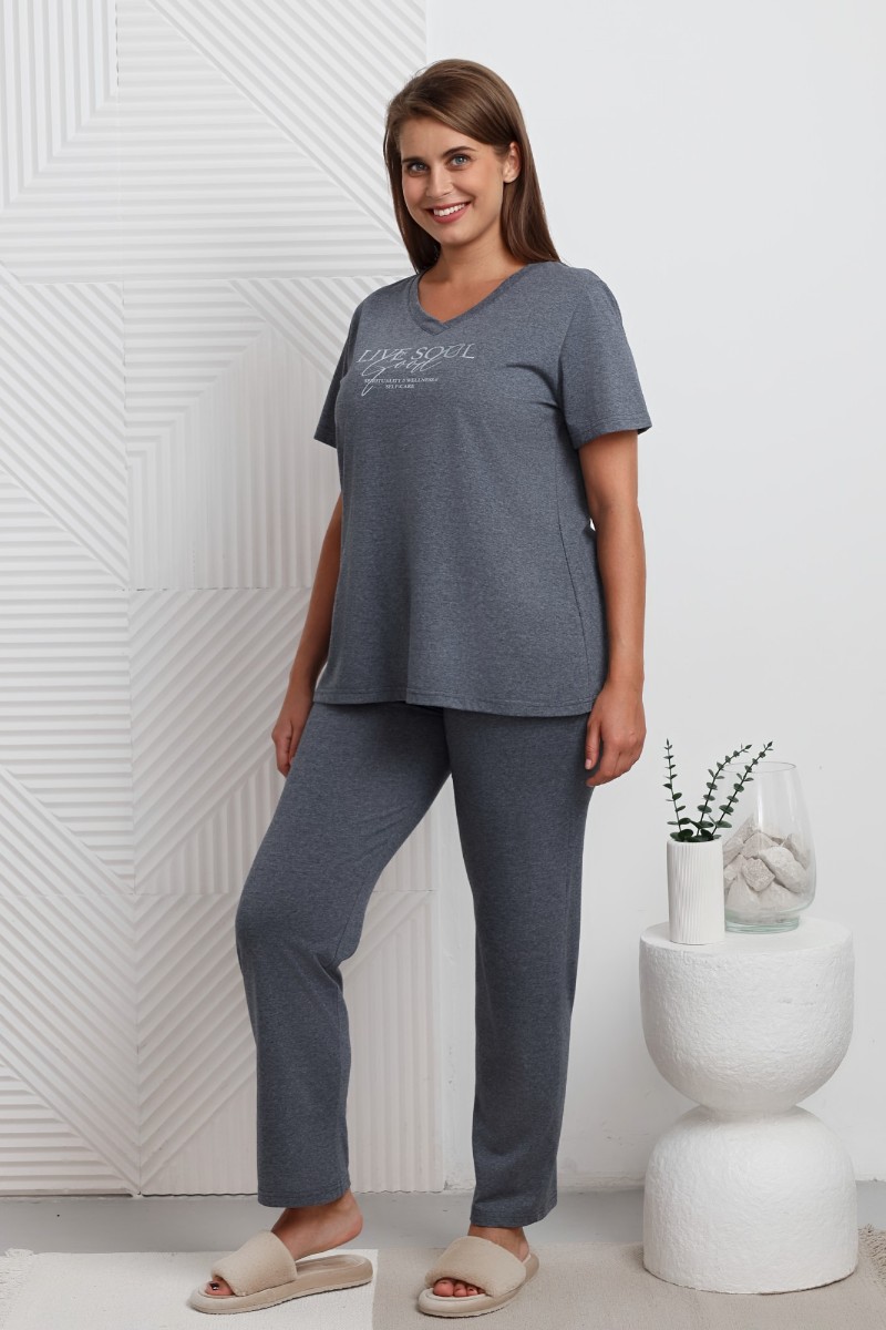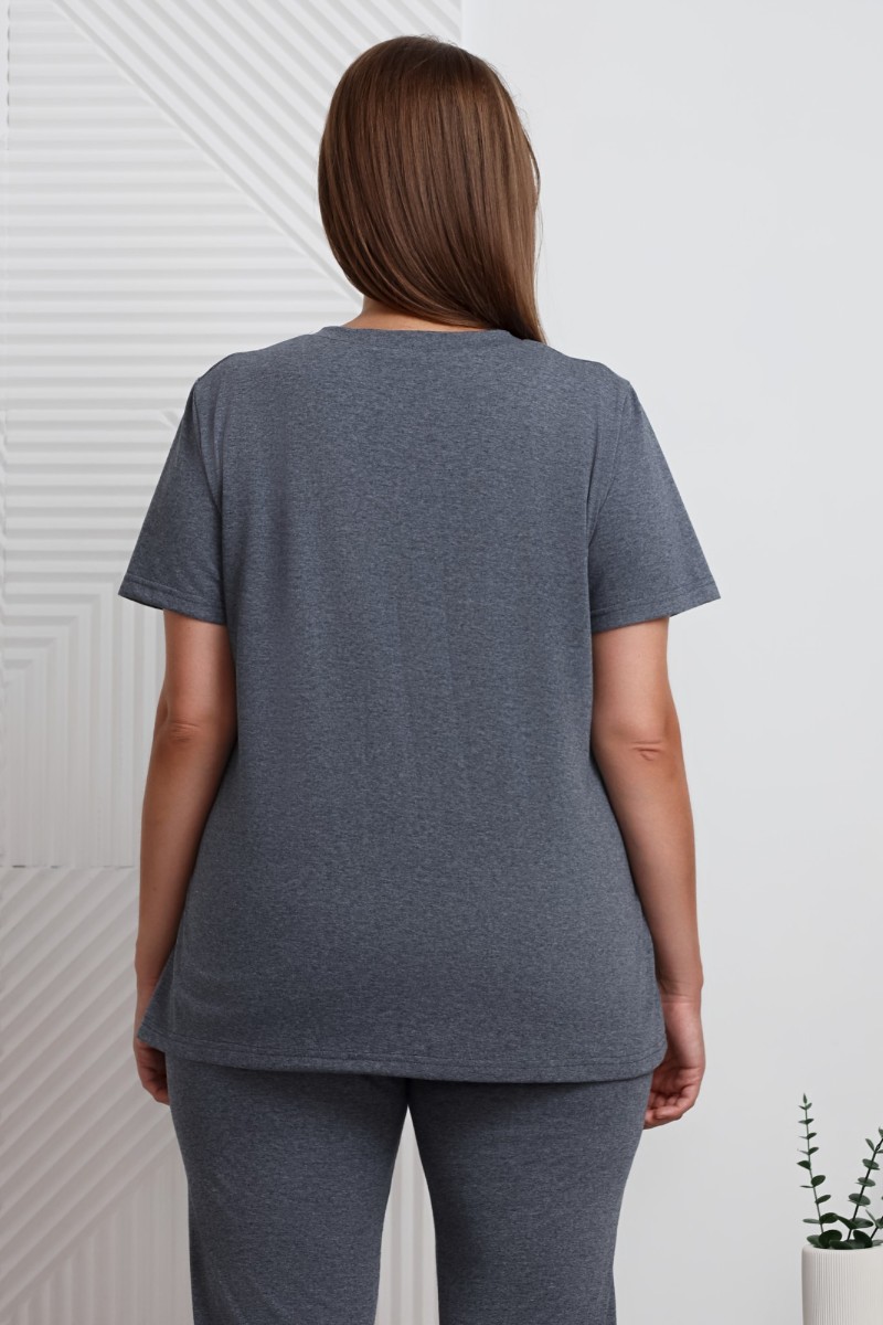 Представляем Вашему вниманию костюм женский из трикотажного гладкокрашенного меланжированого полотна «кулирка», состоящий из футболки и брюк.Футболка - классического покроя, с короткими втачными рукавами, горловиной V- образной формы и принтом на полочке, выполненным в технике «шелкографии». Горловина обработана втачной планкой из основного материала.Брюки - свободного покроя, с карманами в боковых швах, на притачном поясе с эластичной тесьмой внутри.