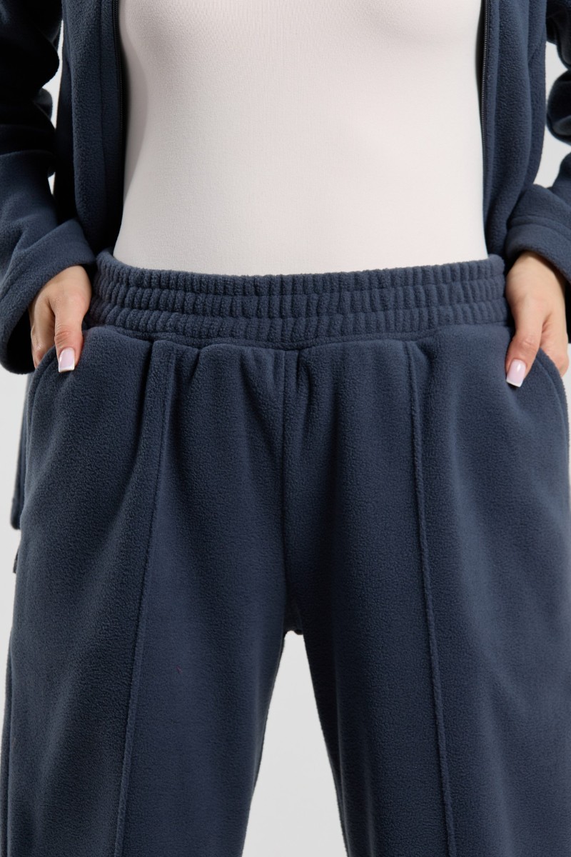 Представляем Вашему вниманию костюм молодежный из гладкокрашенного трикотажного полотна «флис», Толстовка - полуприлегающего силуэта, с длинными втачными рукавами, воротником «стойка», карманами в рельефных швах, центральной бортовой застежкой на тесьму «молния». Брюки длинные, полуприлегающего силуэта, на притачном поясе с эластичной тесьмой внутри и карманами в боковых швах. Передние половины застрочены по центральным линиям, низ брюк обработан подгибкой с вложением эластичной тесьмы и регулируется по ширине с помощью фиксаторов.