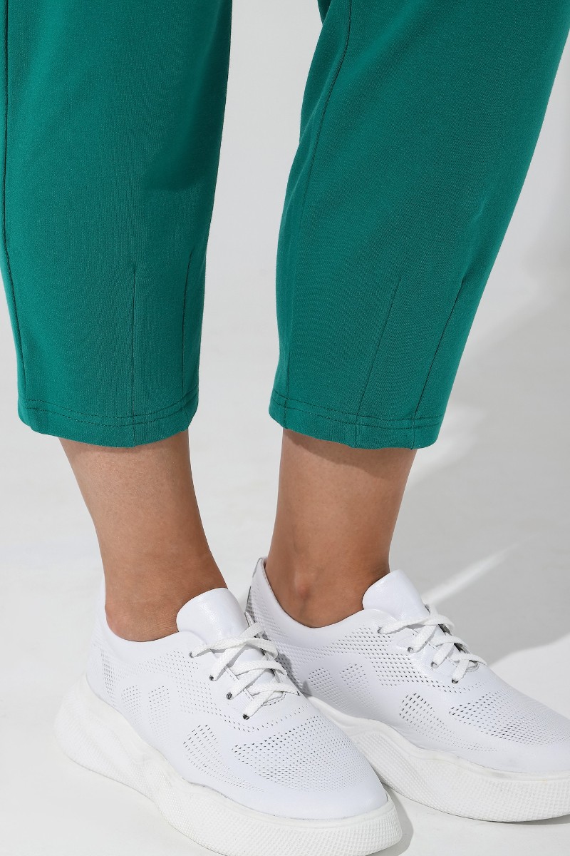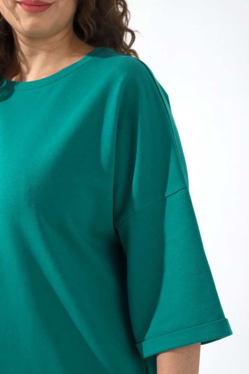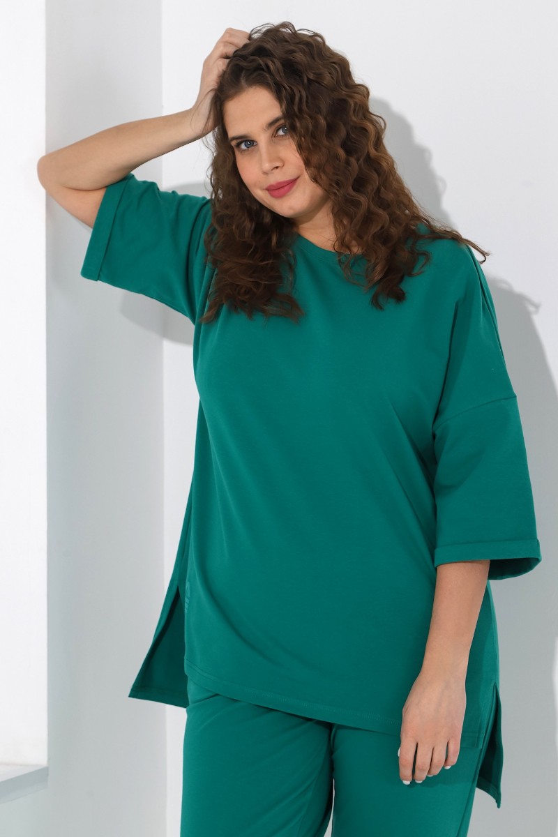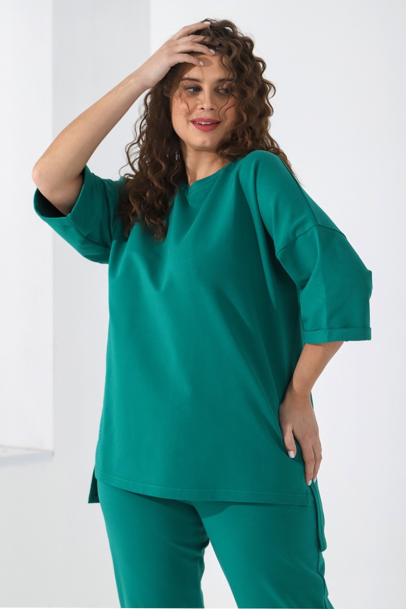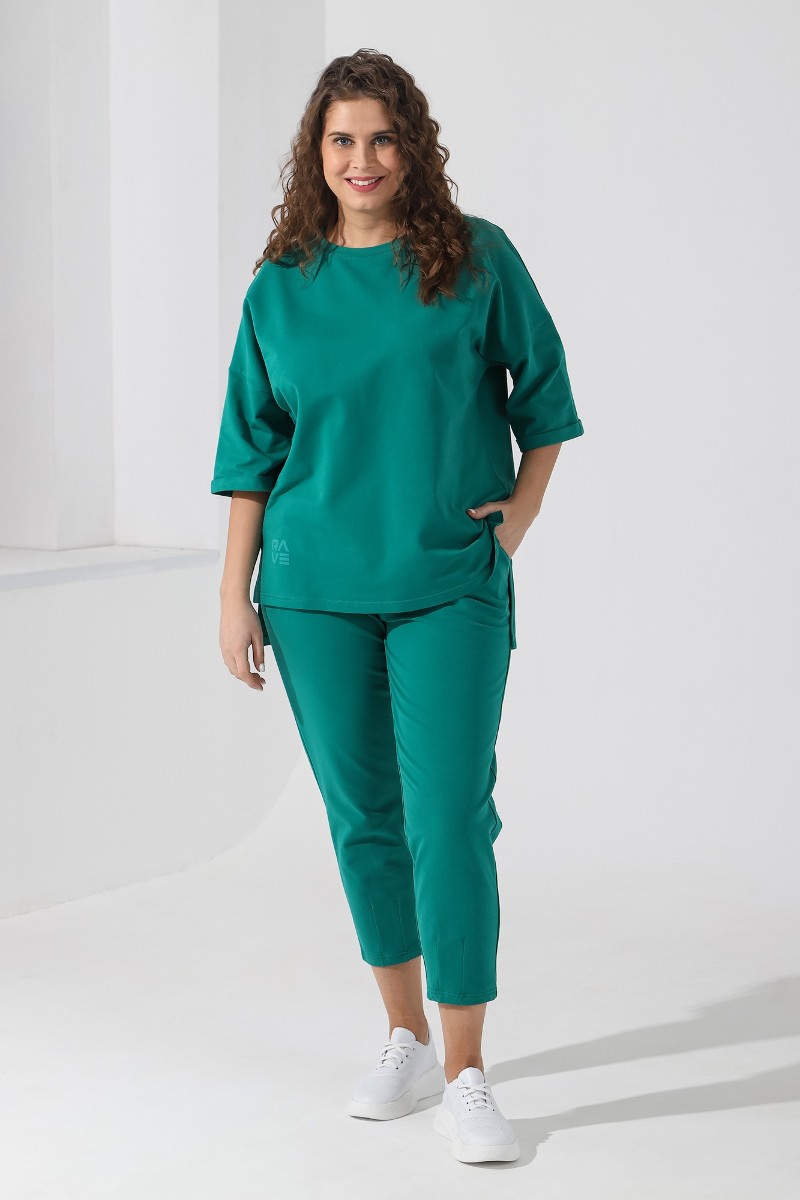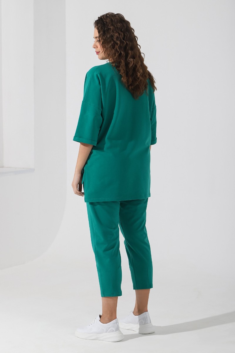 Представляем Вашему вниманию костюм из гладкокрашеного трикотажного полотна «футер-двунитка», состоящий из джемпера и брюк. Джемпер – свободного покроя, с рукавами на основе цельнокроеных длиной до локтя, горловиной овальной формы, обработанной втачной планкой, разрезами в боковых швах и принтом на полочке. Рукава – с цельнокроеными манжетами-отворотами. Модный элемент- разность длины полочки и спинки на 10 см. Брюки – укороченные, на притачном поясе с эластичной тесьмой внутри и карманами в боковых швах. На нижних частях передних и задних половин обработано по две вертикальные вытачки. Страна производитель Узбекистан