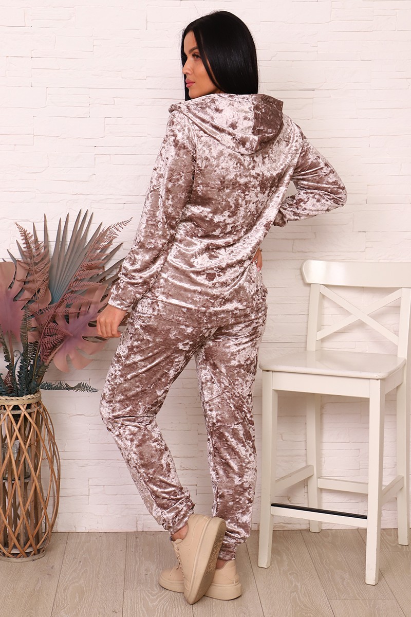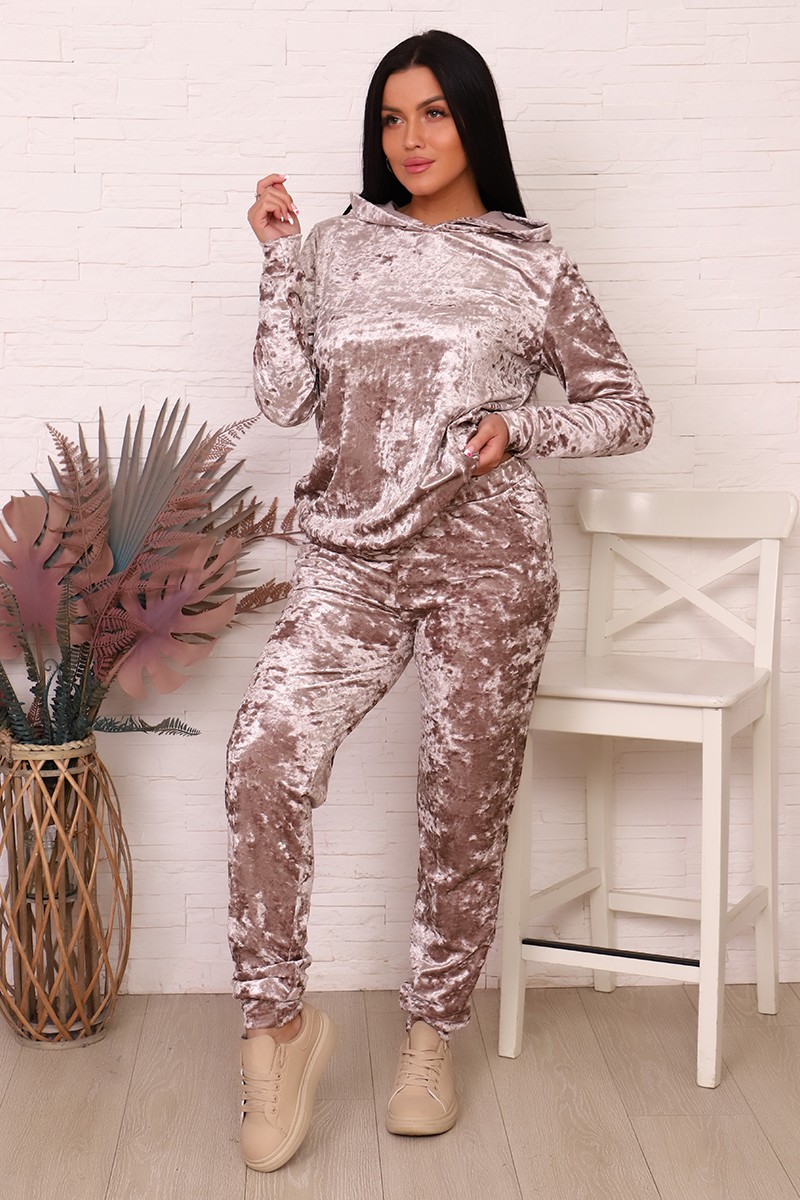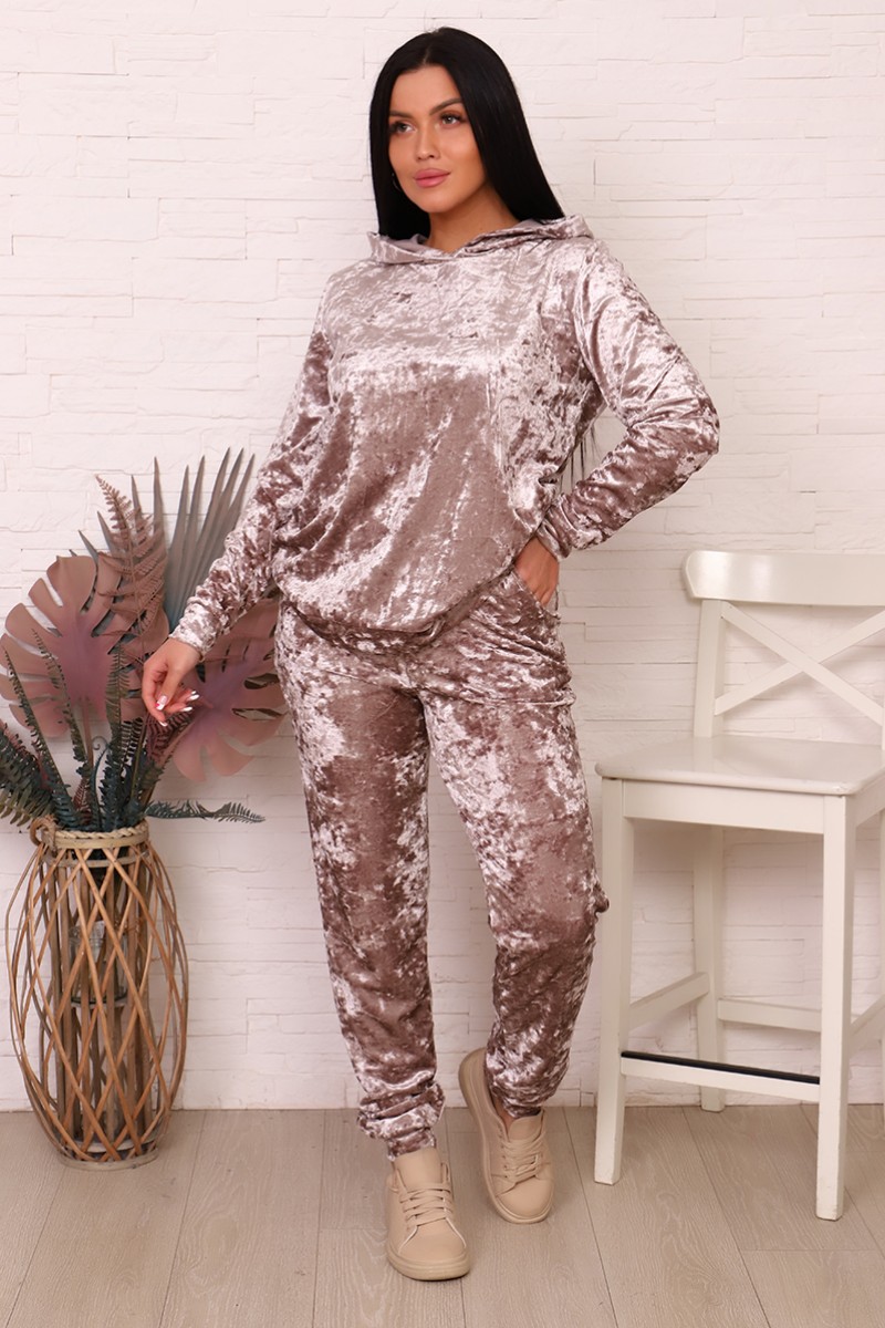 Представляем Вашему вниманию стильный женский костюм с капюшоном, сшитый из приятного телу, высококачественного мраморного велюра. Кофта с длинным рукавом на манжете, брюки с карманами.