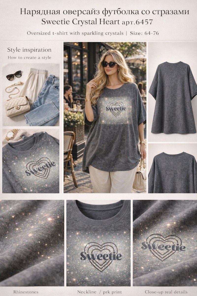 Представляем Вашему вниманию нарядную оверсайз футболку со стразами Sweetie Crystal Heart — Главный Must-Have Сезона (Размеры 64–76). Эта футболка — не просто базовая вещь, это настоящий манифест современной моды для пышных форм. Если вы хотите выглядеть стильно, дорого и следовать последним веяниям фешн-индустрии, модель Crystal Flow Luxe создана специально для вас.