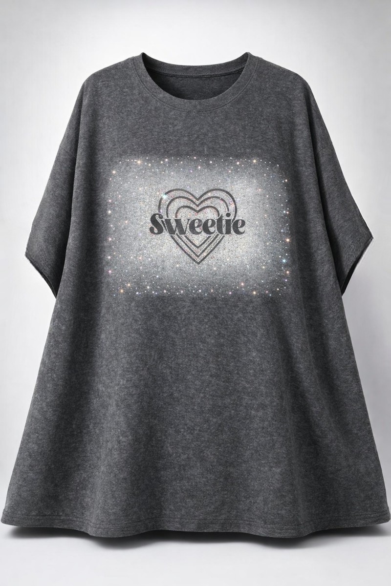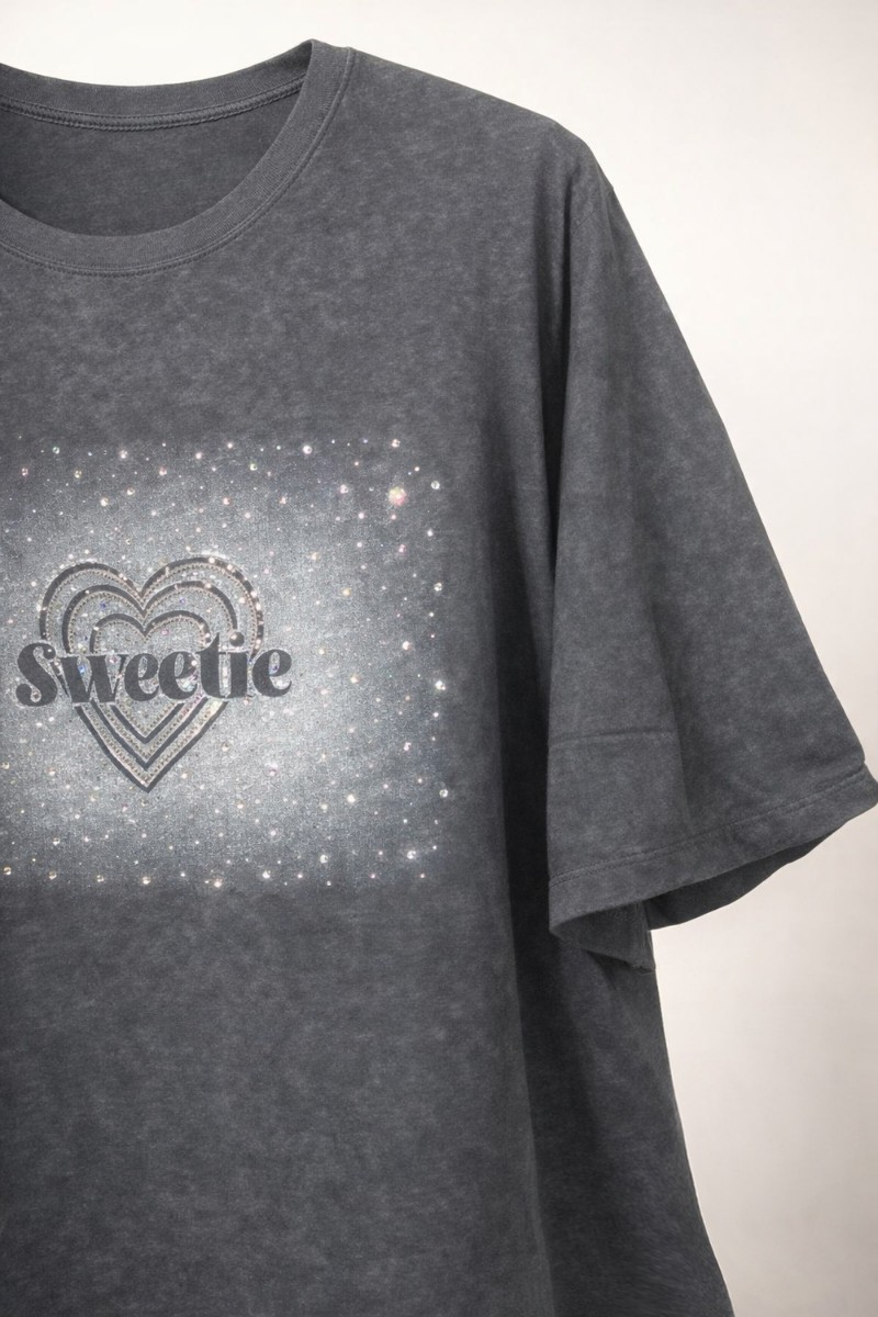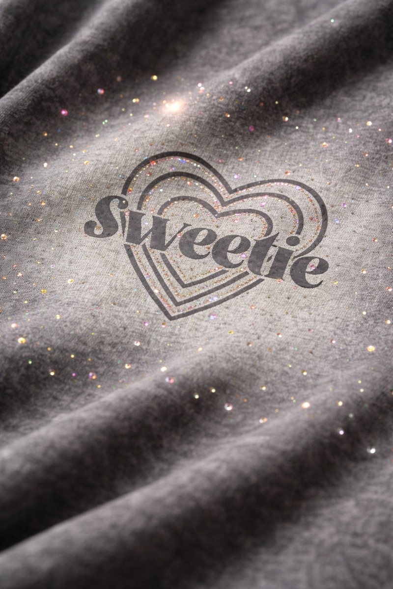 Роскошный дизайн и сияние: Центральным элементом модели является эффектный принт в виде объемного сердца с надписью «Sweetie», окруженный россыпью сверкающих страз. Стразы нанесены по градиентной технологии, создавая эффект тающего сияния.Использована передовая технология фиксации. Стразы останутся на месте — они качественно приделаны, не отклеятся после стирок и не потеряют свой блеск.