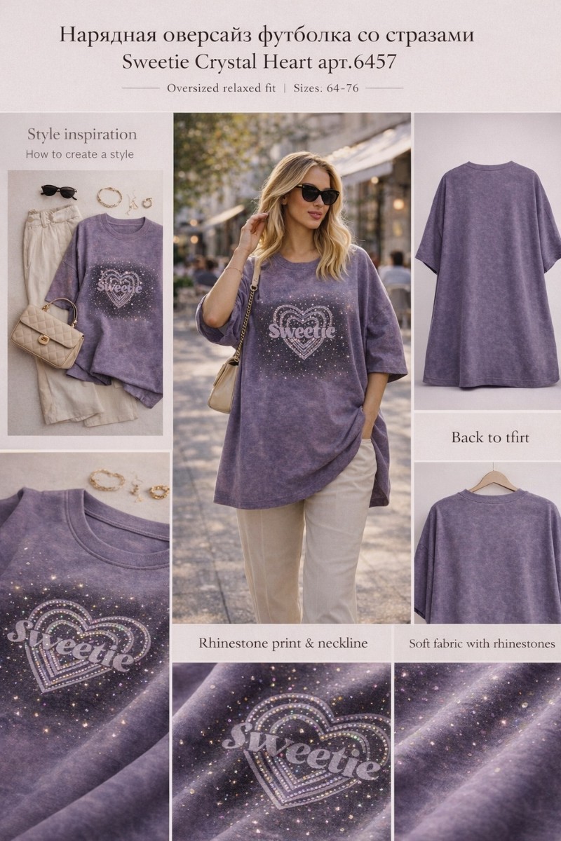 Представляем Вашему вниманию нарядную оверсайз футболку со стразами Sweetie Crystal Heart — Главный Must-Have Сезона (Размеры 64–76). Эта футболка — не просто базовая вещь, это настоящий манифест современной моды для пышных форм. Если вы хотите выглядеть стильно, дорого и следовать последним веяниям фешн-индустрии, модель Crystal Flow Luxe создана специально для вас.