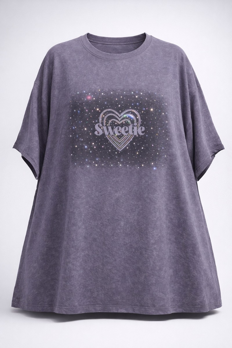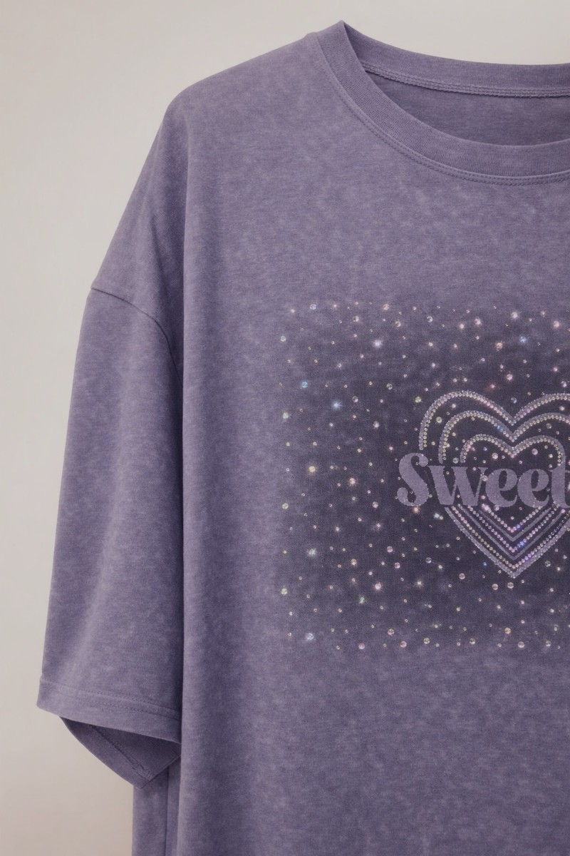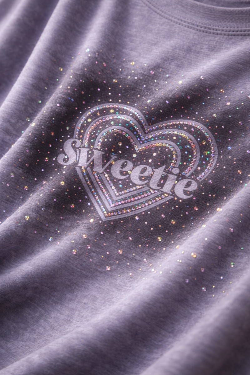 Роскошный дизайн и сияние: Центральным элементом модели является эффектный принт в виде объемного сердца с надписью «Sweetie», окруженный россыпью сверкающих страз. Стразы нанесены по градиентной технологии, создавая эффект тающего сияния.Использована передовая технология фиксации. Стразы останутся на месте — они качественно приделаны, не отклеятся после стирок и не потеряют свой блеск.
