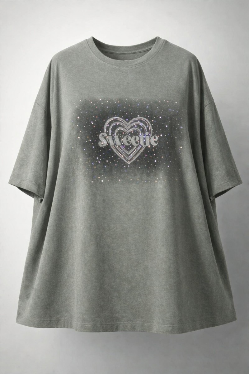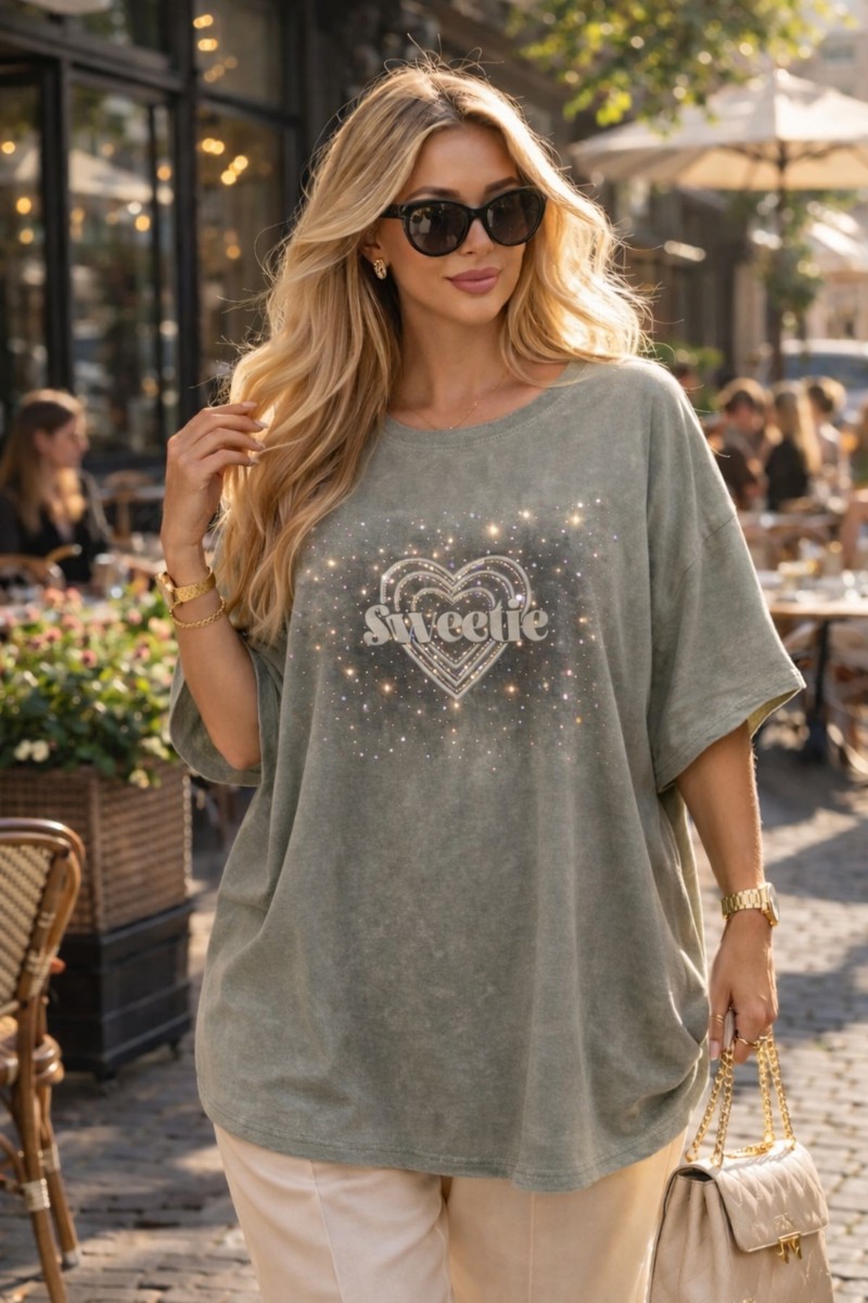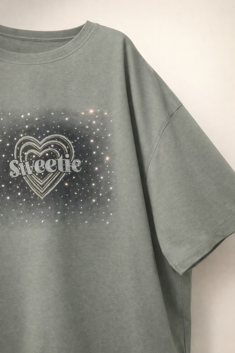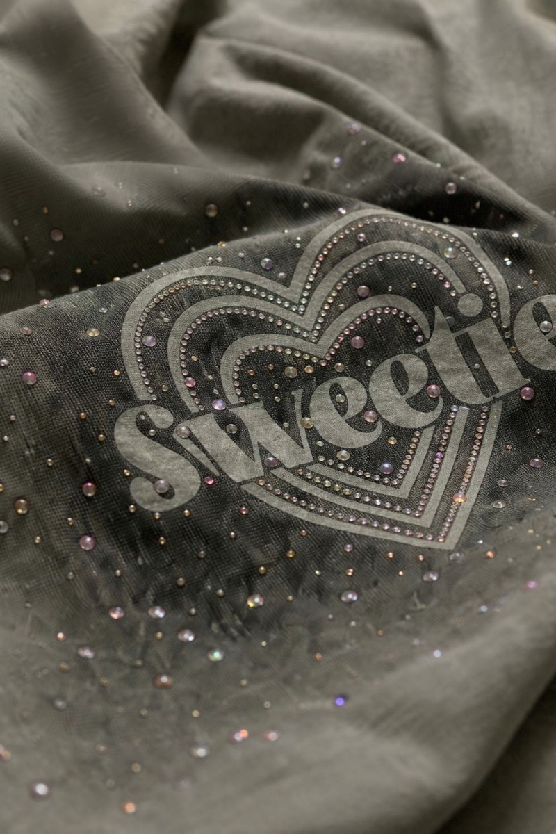 Роскошный дизайн и сияние: Центральным элементом модели является эффектный принт в виде объемного сердца с надписью «Sweetie», окруженный россыпью сверкающих страз. Стразы нанесены по градиентной технологии, создавая эффект тающего сияния.Использована передовая технология фиксации. Стразы останутся на месте — они качественно приделаны, не отклеятся после стирок и не потеряют свой блеск.