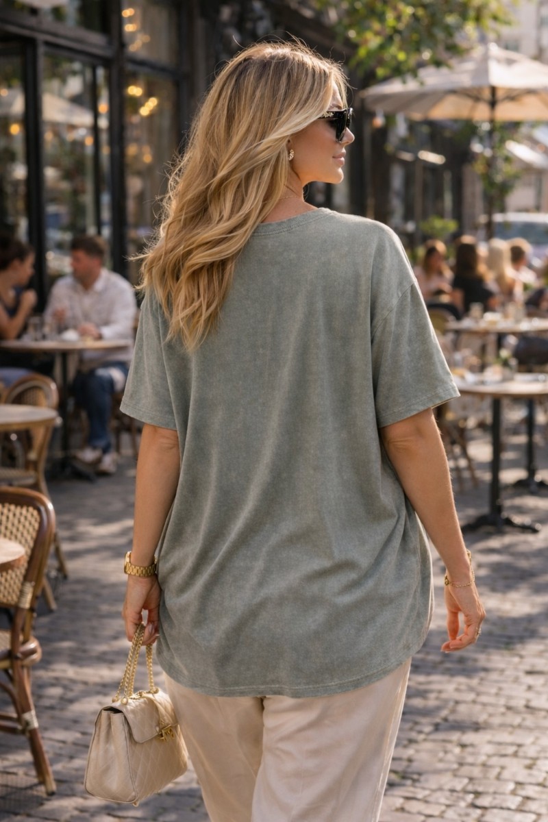 ✨ Тренд, который нельзя пропустить: Эффект «Варенки» и Винтажный Шик Забудьте о скучных однотонных тканях! В этом сезоне бал правит сложная обработка материала. Наша футболка выполнена в технике acid-wash (вареный хлопок), которая придает изделию невероятную визуальную глубину и текстуру.