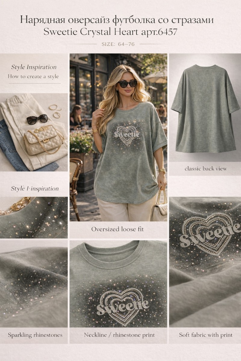 Представляем Вашему вниманию нарядную оверсайз футболку со стразами Sweetie Crystal Heart — Главный Must-Have Сезона (Размеры 64–76). Эта футболка — не просто базовая вещь, это настоящий манифест современной моды для пышных форм. Если вы хотите выглядеть стильно, дорого и следовать последним веяниям фешн-индустрии, модель Crystal Flow Luxe создана специально для вас.