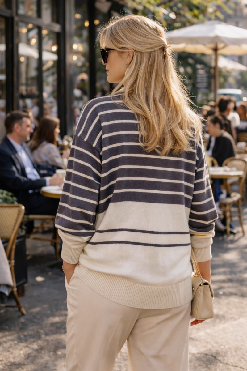 Сочетайте джемпер с джинсами, узкими брюками или юбкой-карандаш для повседневного образа. Добавьте ботильоны или кроссовки для завершенного лука. В прохладные дни наденьте его поверх водолазки или рубашки — контрастные полосы создадут визуальный акцент, а акрил сохранит тепло.