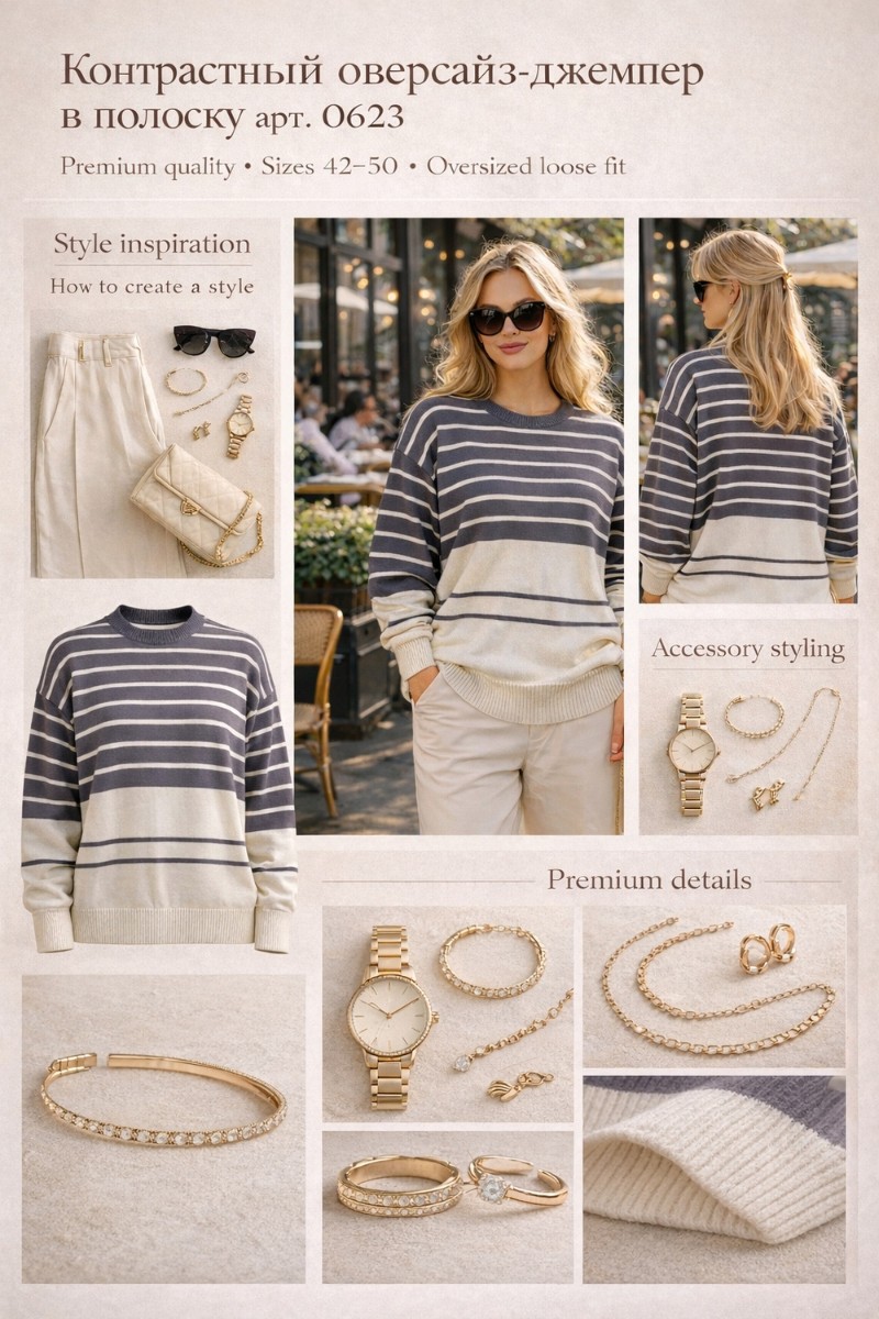 ✅ Оверсайз-крой — свободный силуэт создает эффект легкой небрежности, который подчеркивает современный стиль. В размерах 42–52 джемпер сидит комфортно, не теряя элегантности, а его длина идеально дополняет любую фигуру.