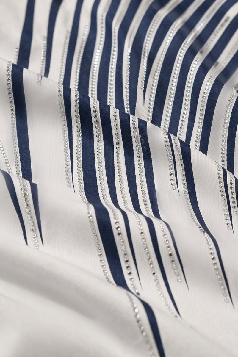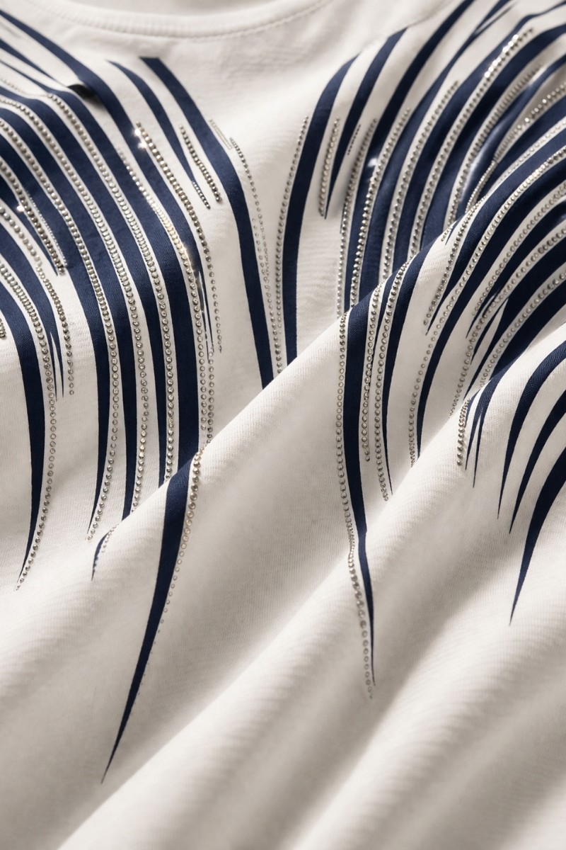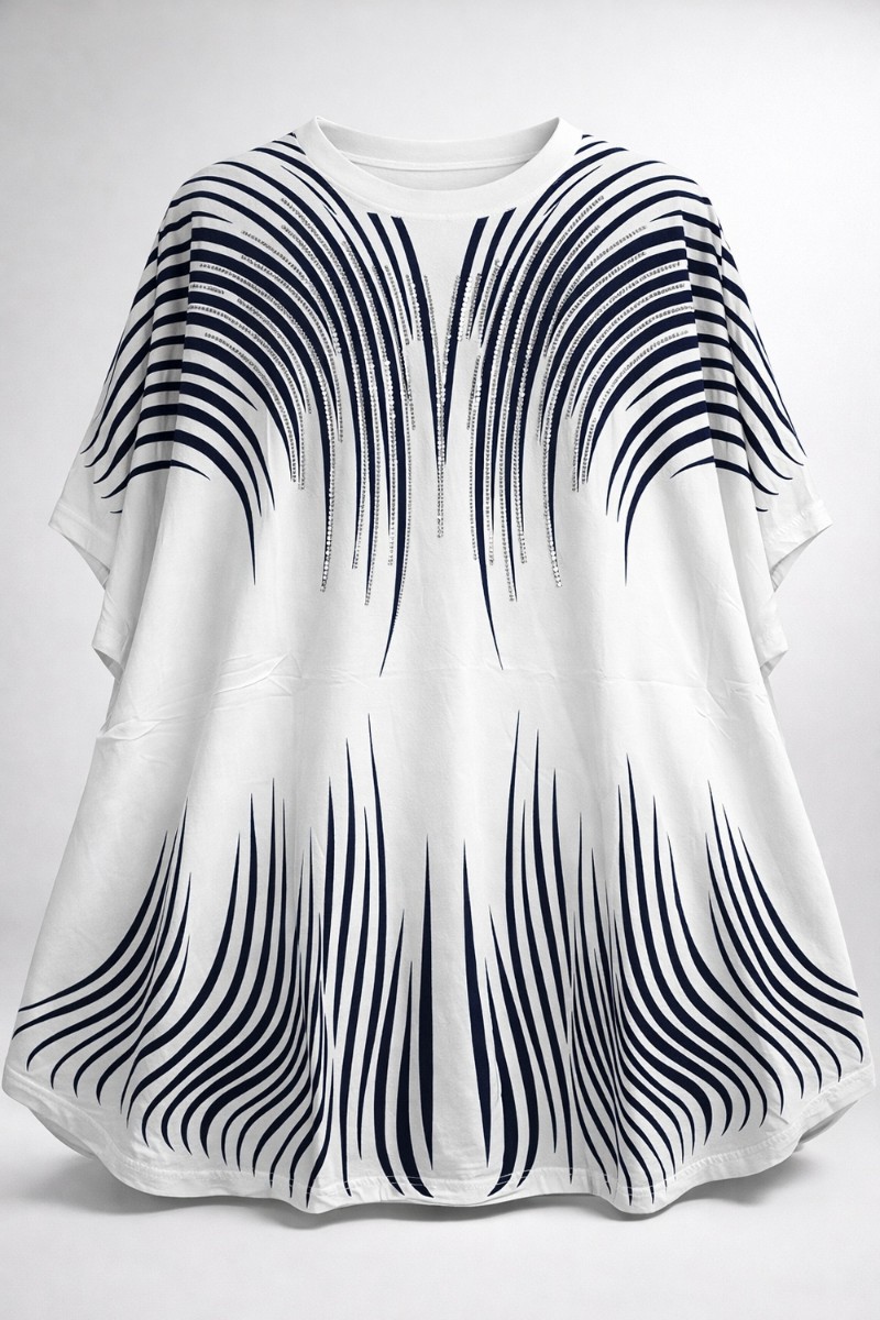Дизайн, который восхищает: Главная изюминка модели — динамичный принт из волнистых линий, напоминающих потоки линий. Верхняя часть узора и зона декольте инкрустированы качественными стразами: стразы надежно закреплены профессиональным оборудованием, они не отклеятся после стирки и будут радовать вас долгое время. На солнце и при искусственном освещении композиция начинает особенно красиво переливаться, добавляя образу нотки шика.