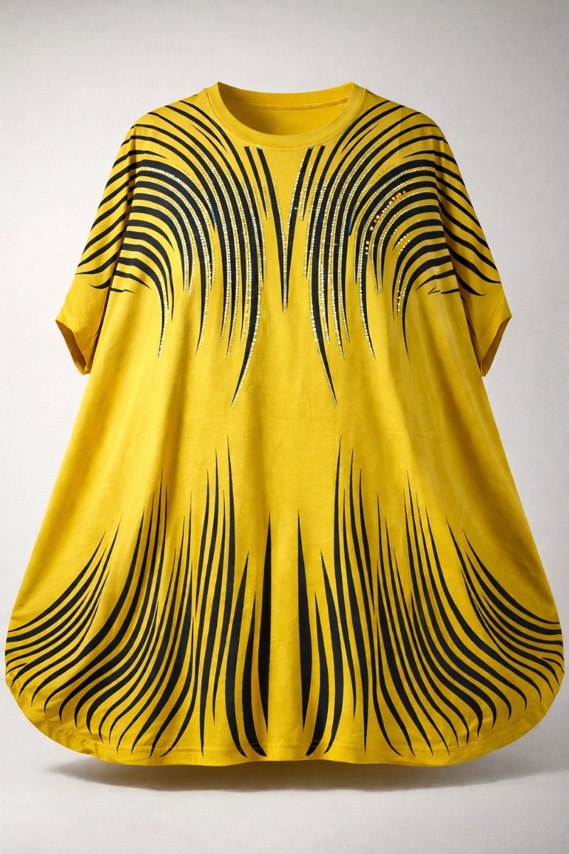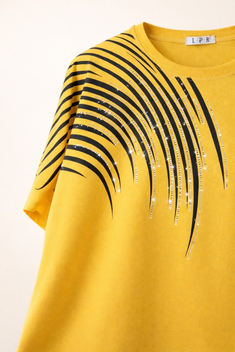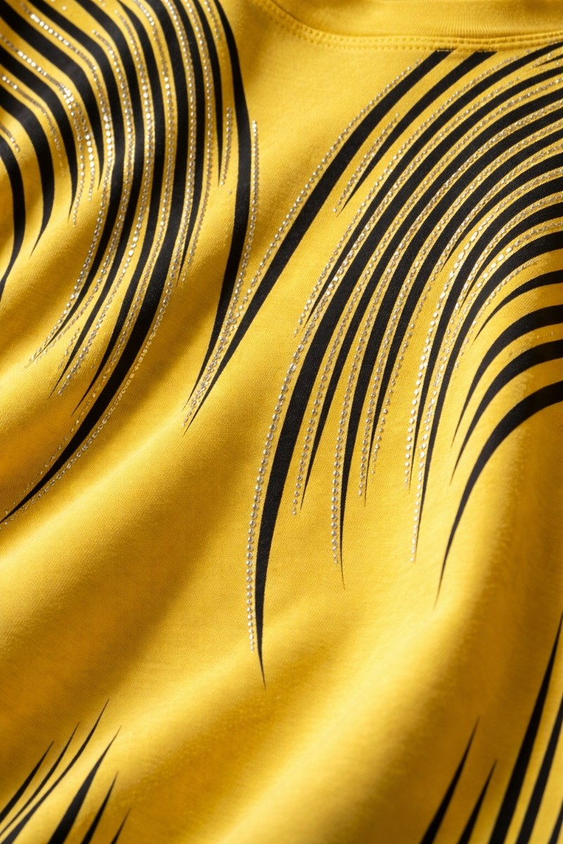 Дизайн, который восхищает: Главная изюминка модели — динамичный принт из волнистых линий, напоминающих потоки линий. Верхняя часть узора и зона декольте инкрустированы качественными стразами: стразы надежно закреплены профессиональным оборудованием, они не отклеятся после стирки и будут радовать вас долгое время. На солнце и при искусственном освещении композиция начинает особенно красиво переливаться, добавляя образу нотки шика.