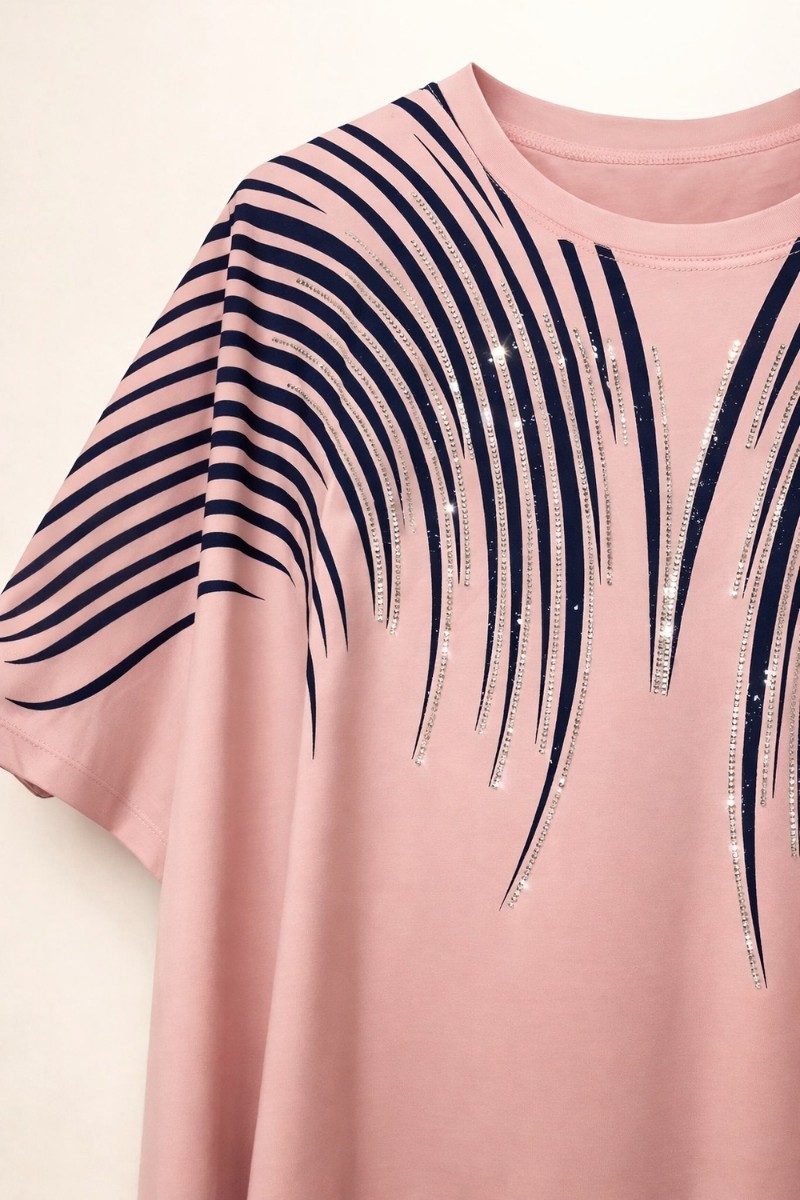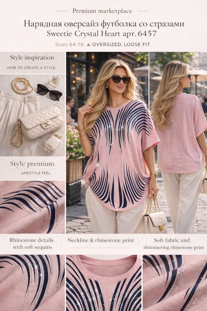 Представляем Вашему вниманию нарядную оверсайз футболку со стразами Crystal Flow Luxe — откройте для себя идеальное сочетание комфорта и стиля с нашей новинкой.