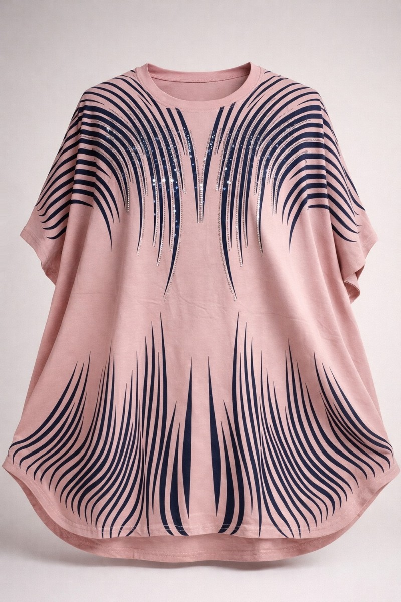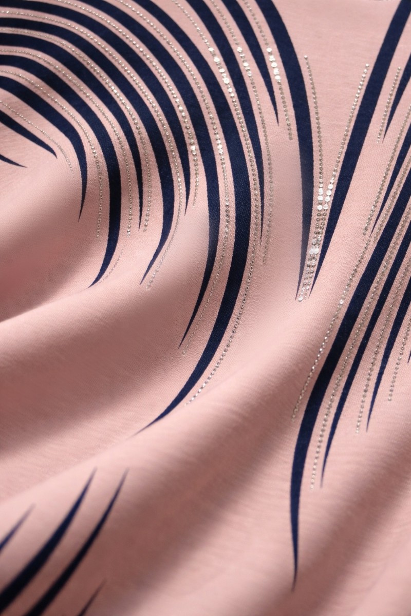 Дизайн, который восхищает: Главная изюминка модели — динамичный принт из волнистых линий, напоминающих потоки линий. Верхняя часть узора и зона декольте инкрустированы качественными стразами: стразы надежно закреплены профессиональным оборудованием, они не отклеятся после стирки и будут радовать вас долгое время. На солнце и при искусственном освещении композиция начинает особенно красиво переливаться, добавляя образу нотки шика.