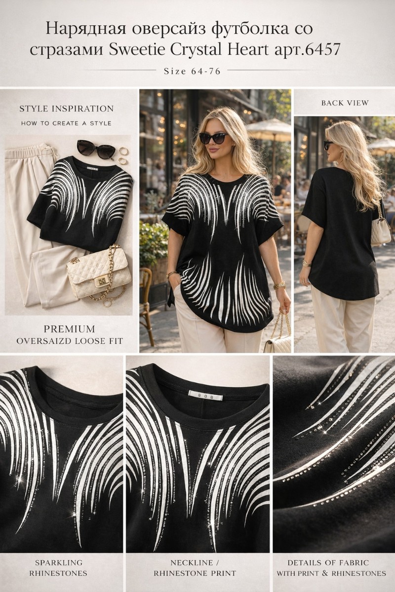 Представляем Вашему вниманию нарядную оверсайз футболку со стразами Crystal Flow Luxe — откройте для себя идеальное сочетание комфорта и стиля с нашей новинкой.