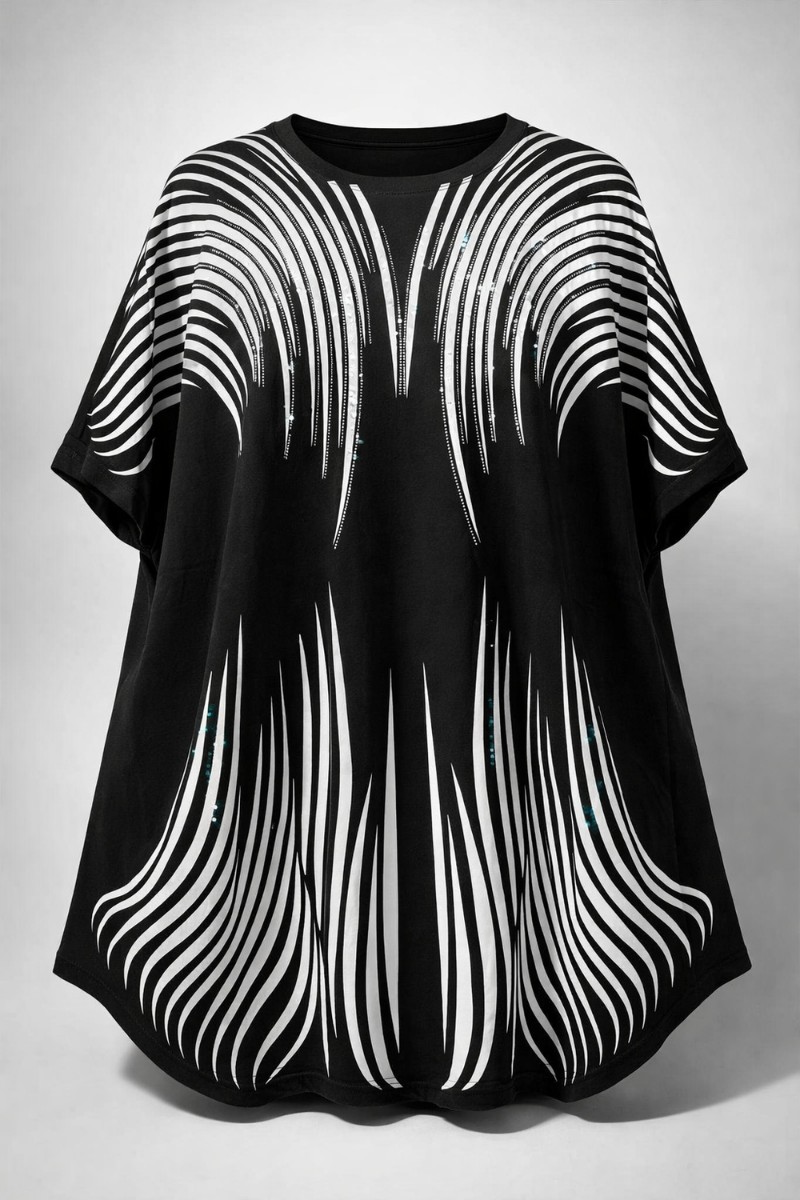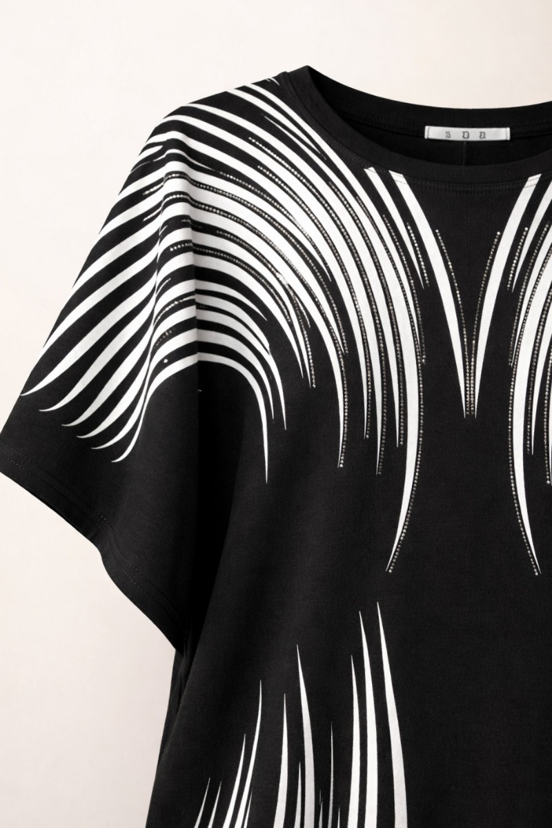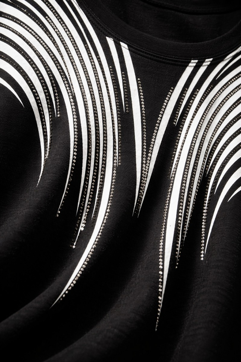 Дизайн, который восхищает: Главная изюминка модели — динамичный принт из волнистых линий, напоминающих потоки линий. Верхняя часть узора и зона декольте инкрустированы качественными стразами: стразы надежно закреплены профессиональным оборудованием, они не отклеятся после стирки и будут радовать вас долгое время. На солнце и при искусственном освещении композиция начинает особенно красиво переливаться, добавляя образу нотки шика.