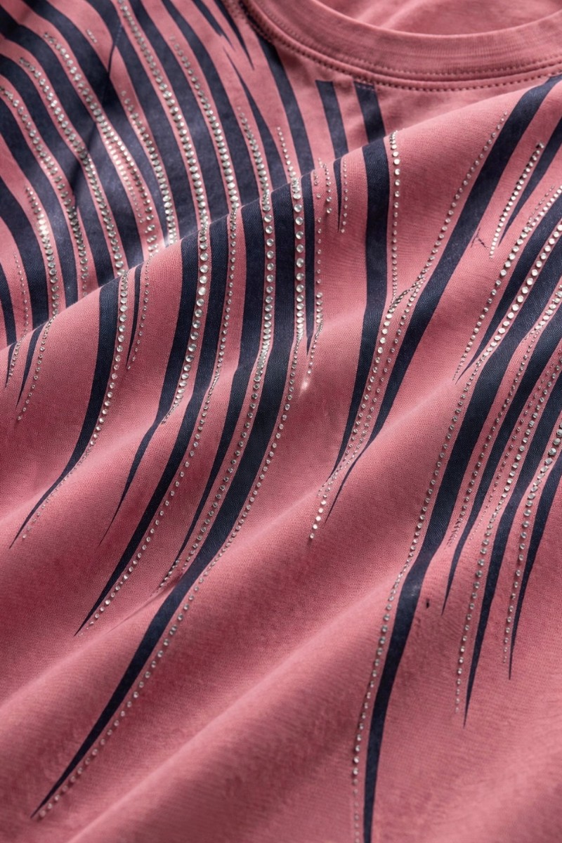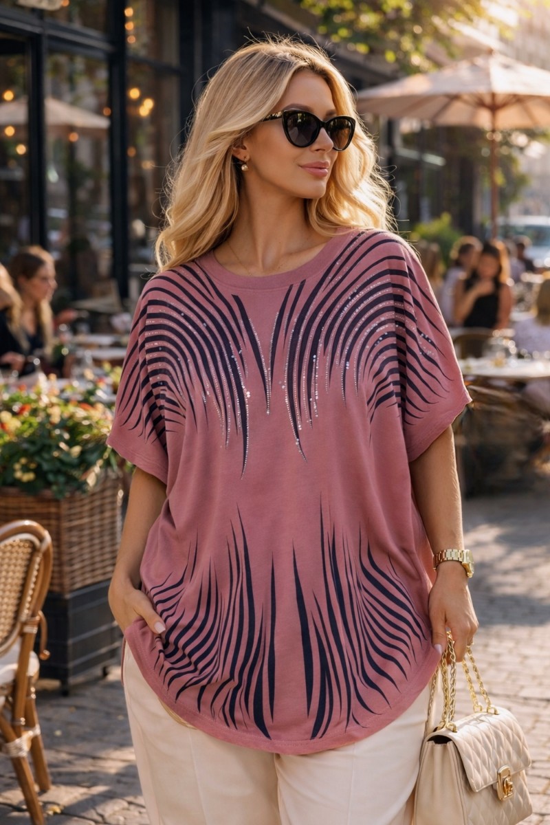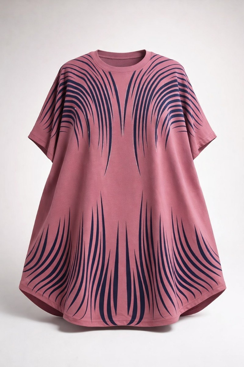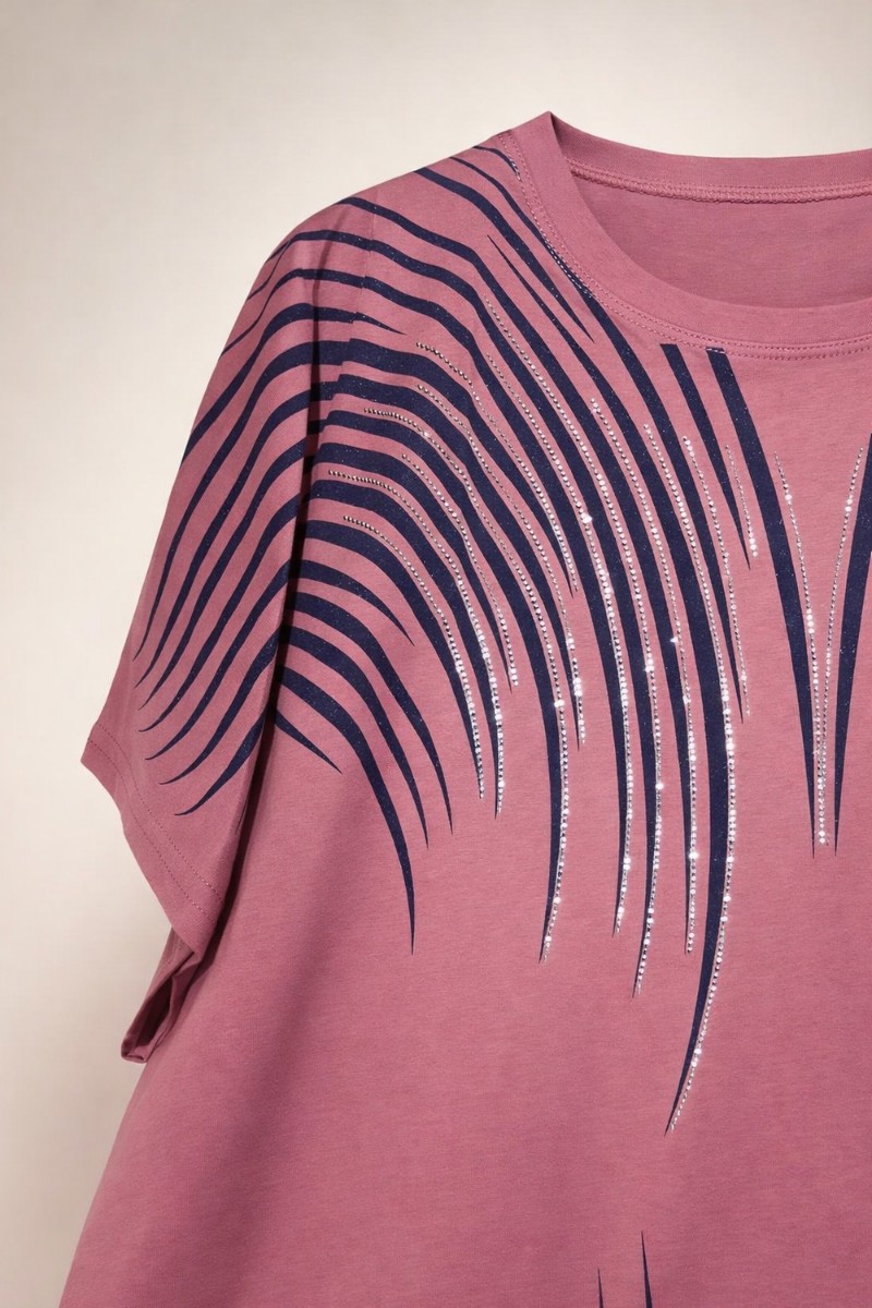 Дизайн, который восхищает: Главная изюминка модели — динамичный принт из волнистых линий, напоминающих потоки линий. Верхняя часть узора и зона декольте инкрустированы качественными стразами: стразы надежно закреплены профессиональным оборудованием, они не отклеятся после стирки и будут радовать вас долгое время. На солнце и при искусственном освещении композиция начинает особенно красиво переливаться, добавляя образу нотки шика.