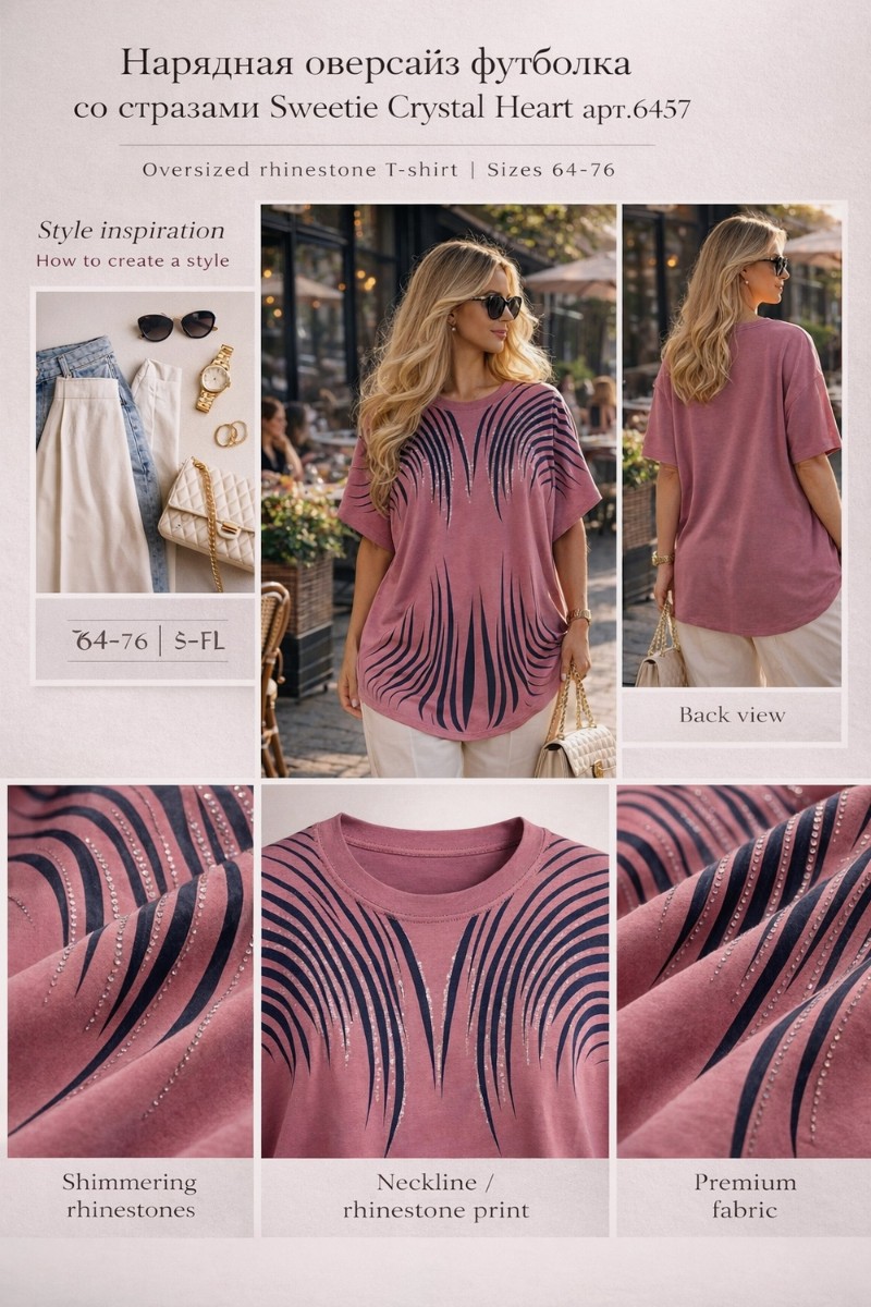 Представляем Вашему вниманию нарядную оверсайз футболку со стразами Crystal Flow Luxe — откройте для себя идеальное сочетание комфорта и стиля с нашей новинкой.