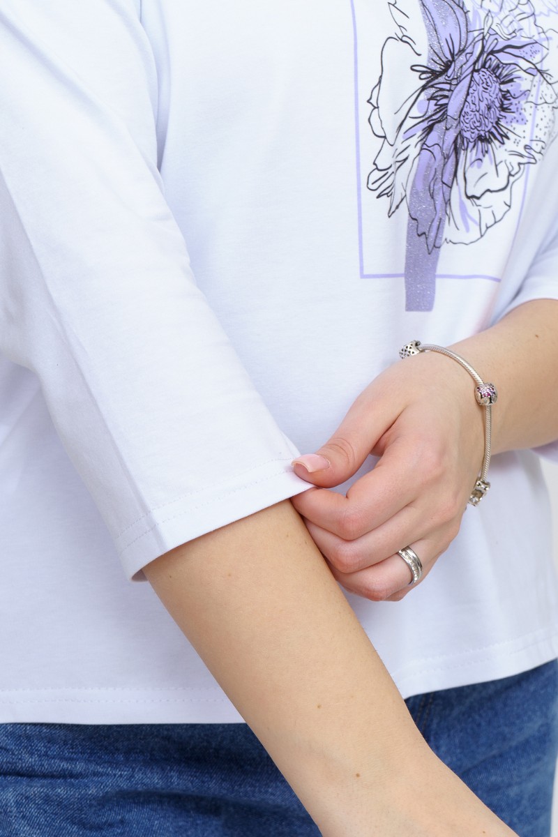 Представляем Вашему вниманию изящный женский лонгслив прямого силуэта с округлой горловиной, с рукавом 3/4. Полочка изделия украшена принтом. Расцветка изделия красиво смотрится и поднимает настроение. В нём Вы будете чувствовать себя комфортно и уверенно.