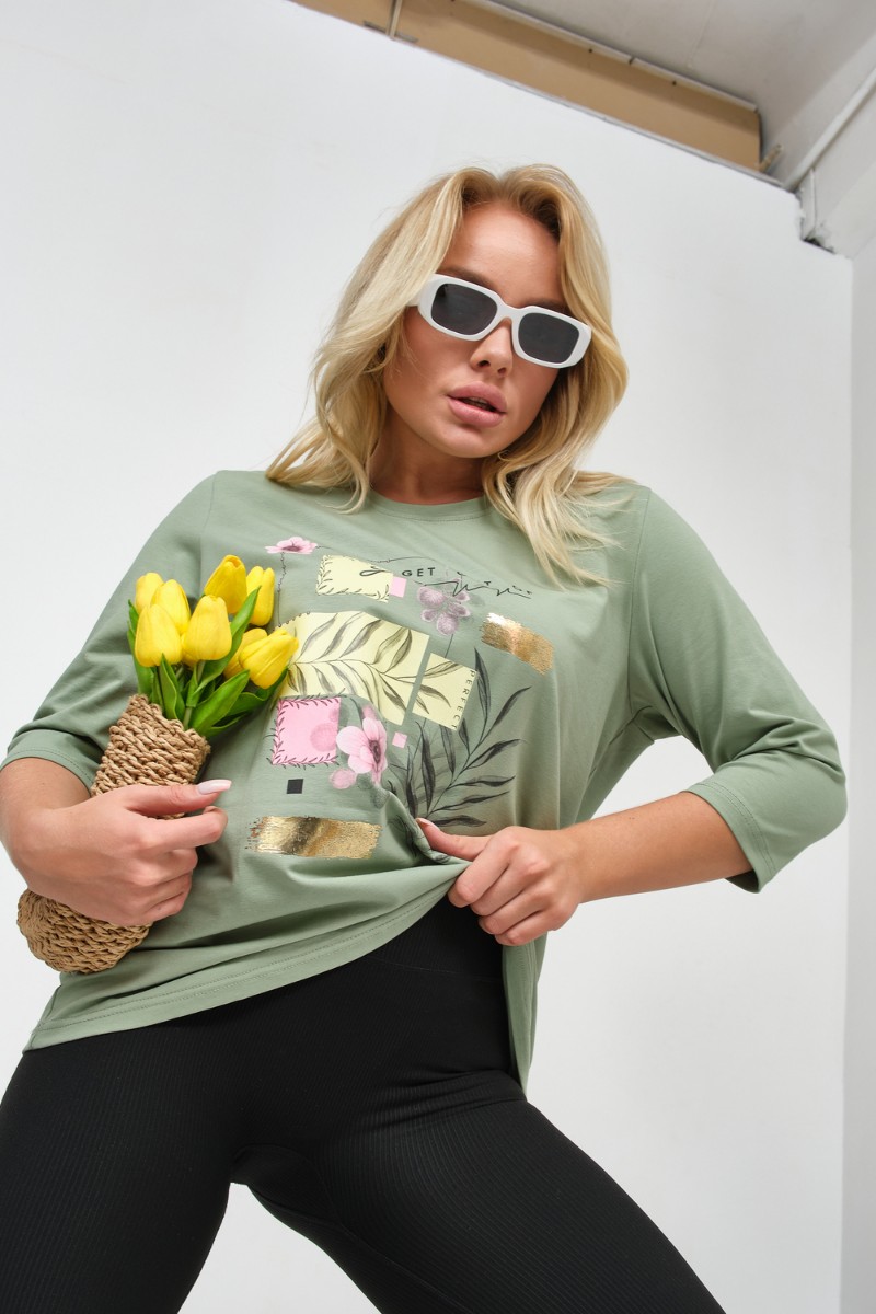 Представляем Вашему вниманию изящный женский лонгслив прямого силуэта с округлой горловиной. Рукав втачной, длиной 3/4. На полочке нанесен принт. Расцветка изделия красиво смотрится и поднимает настроение. В нём Вы будете чувствовать себя комфортно и уверенно.