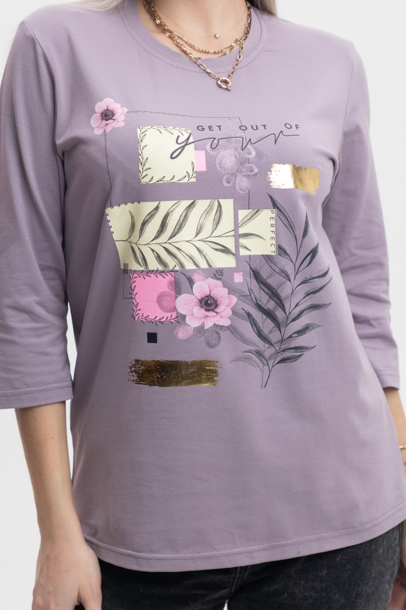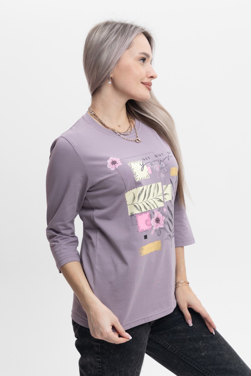 Представляем Вашему вниманию изящный женский лонгслив прямого силуэта с округлой горловиной. Рукав втачной, длиной 3/4. На полочке нанесен принт. Расцветка изделия красиво смотрится и поднимает настроение. В нём Вы будете чувствовать себя комфортно и уверенно.