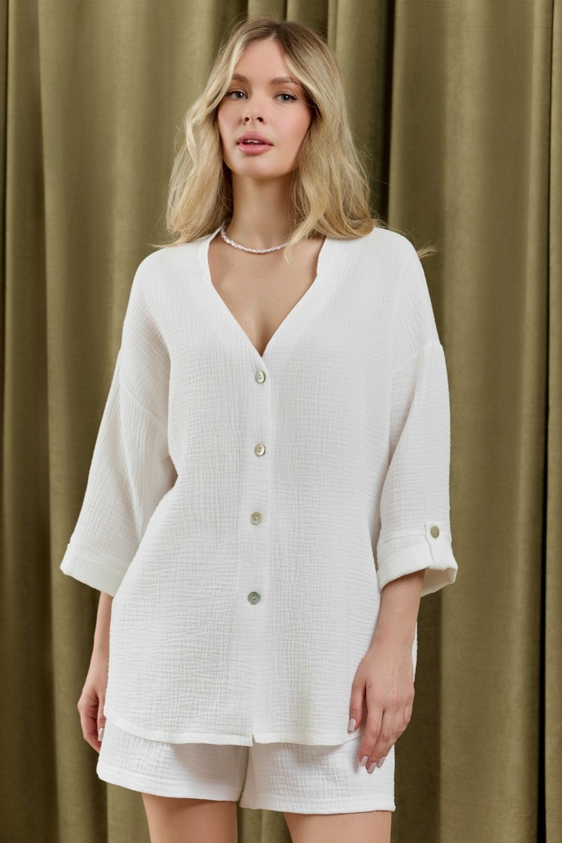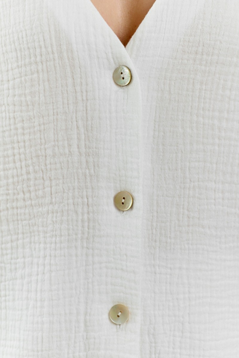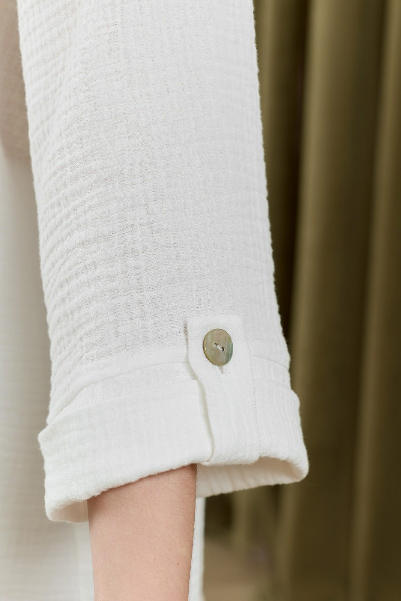 Представляем Вашему вниманию женскую блузку из фактурного гладкокрашеного полотна, с втачными рукавами длиной 3/4, с центральной бортовой застежкой на 4 обметанные петли и 4 пуговицы, с горловиной фигурной формы и небольшим отделочным воротником. Нижние срезы рукавов и низ изделия обработаны подгибкой. Рукава - с хлястиками, с петлей и пуговицей, позволяющими регулировать длину рукавов на фигуре и создающими красивую драпировку.