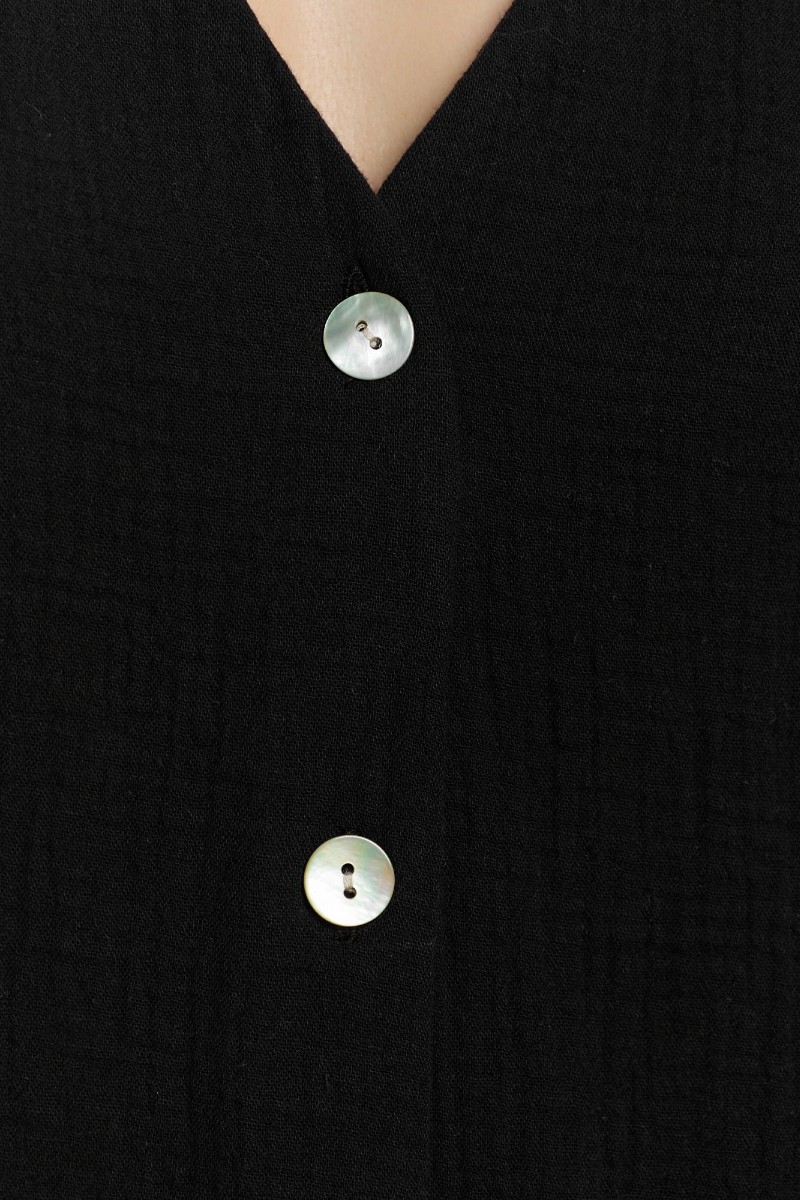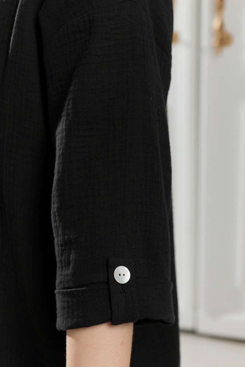 Представляем Вашему вниманию женскую блузку из фактурного гладкокрашеного полотна, с втачными рукавами длиной 3/4, с центральной бортовой застежкой на 4 обметанные петли и 4 пуговицы, с горловиной фигурной формы и небольшим отделочным воротником. Нижние срезы рукавов и низ изделия обработаны подгибкой. Рукава - с хлястиками, с петлей и пуговицей, позволяющими регулировать длину рукавов на фигуре и создающими красивую драпировку.