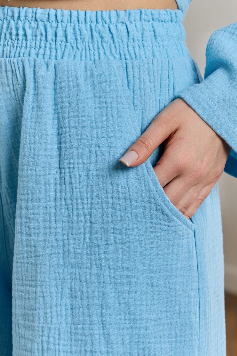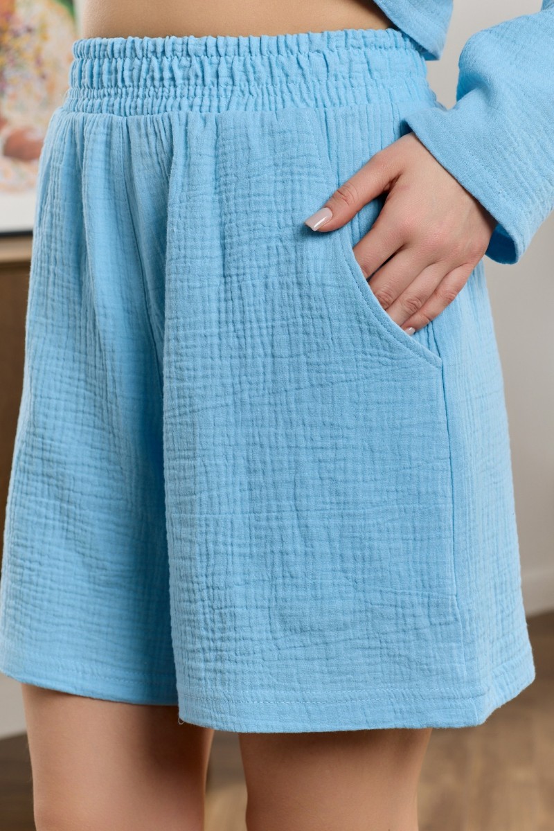 Представляем Вашему вниманию шорты женские из фактурного гладкокрашеного полотна, средней длины, на притачном поясе с эластичной тесьмой внутри, с карманами в боковых швах. Нижние срезы обработаны подгибкой.