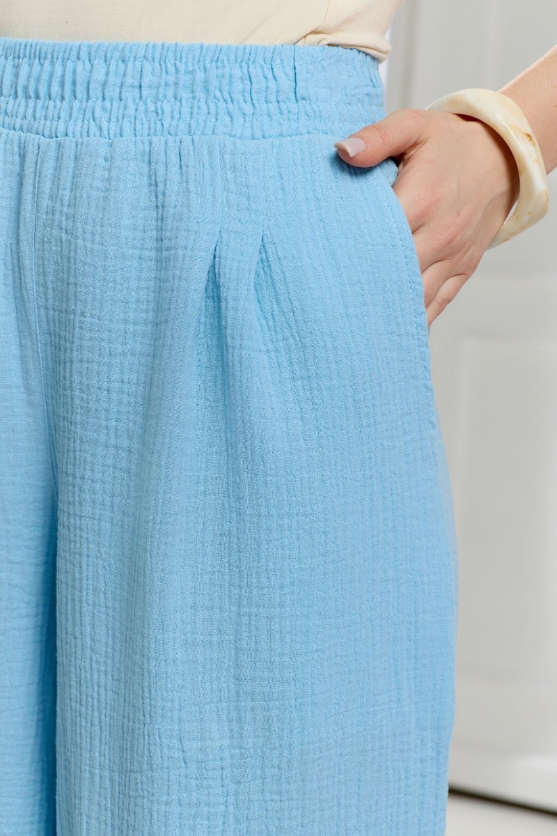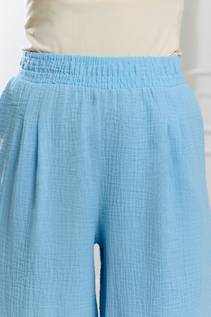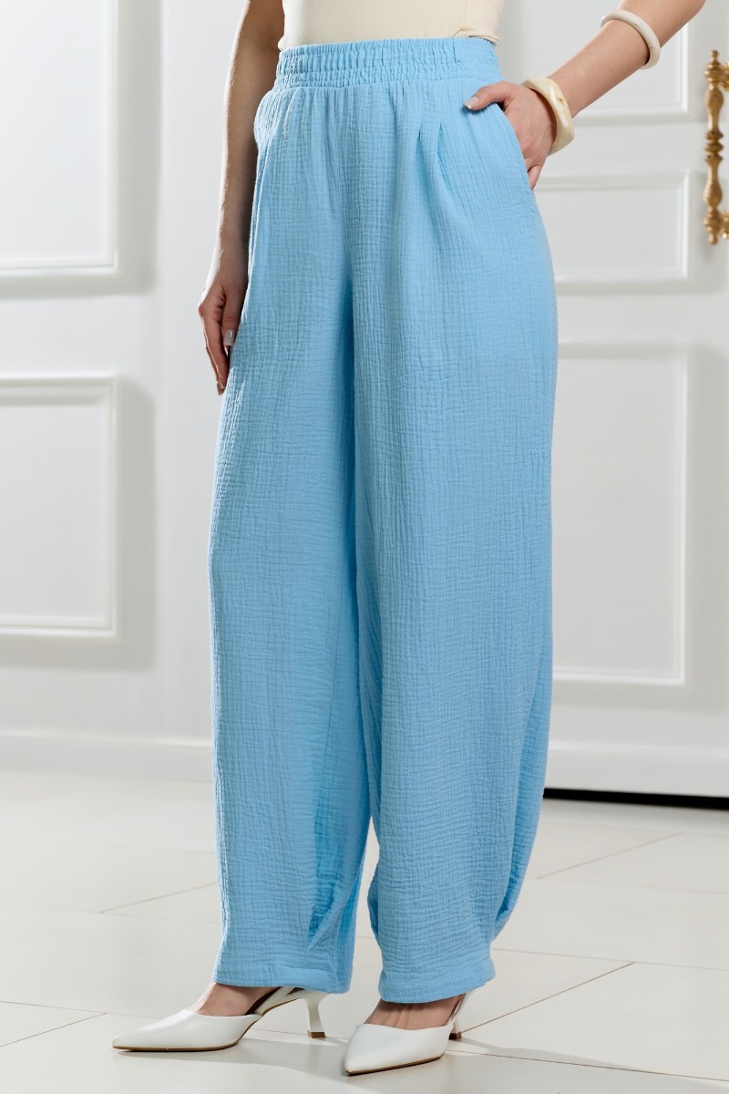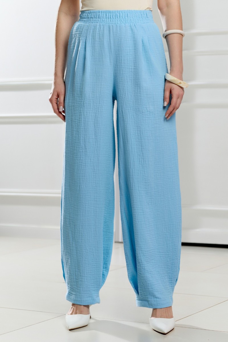 Представляем Вашему вниманию брюки женские из фактурного гладкокрашеного полотна длинные, свободного покроя, на притачном поясе с эластичной тесьмой внутри, с карманами в боковых швах. По верхнему краю передних половин обработаны по две складки с обеих сторон. По низу брюк - также по 1 складке в боковых и шаговых швах.