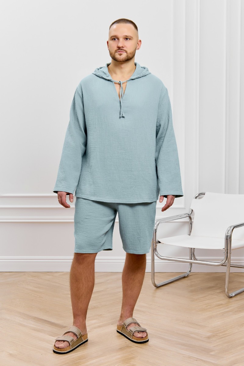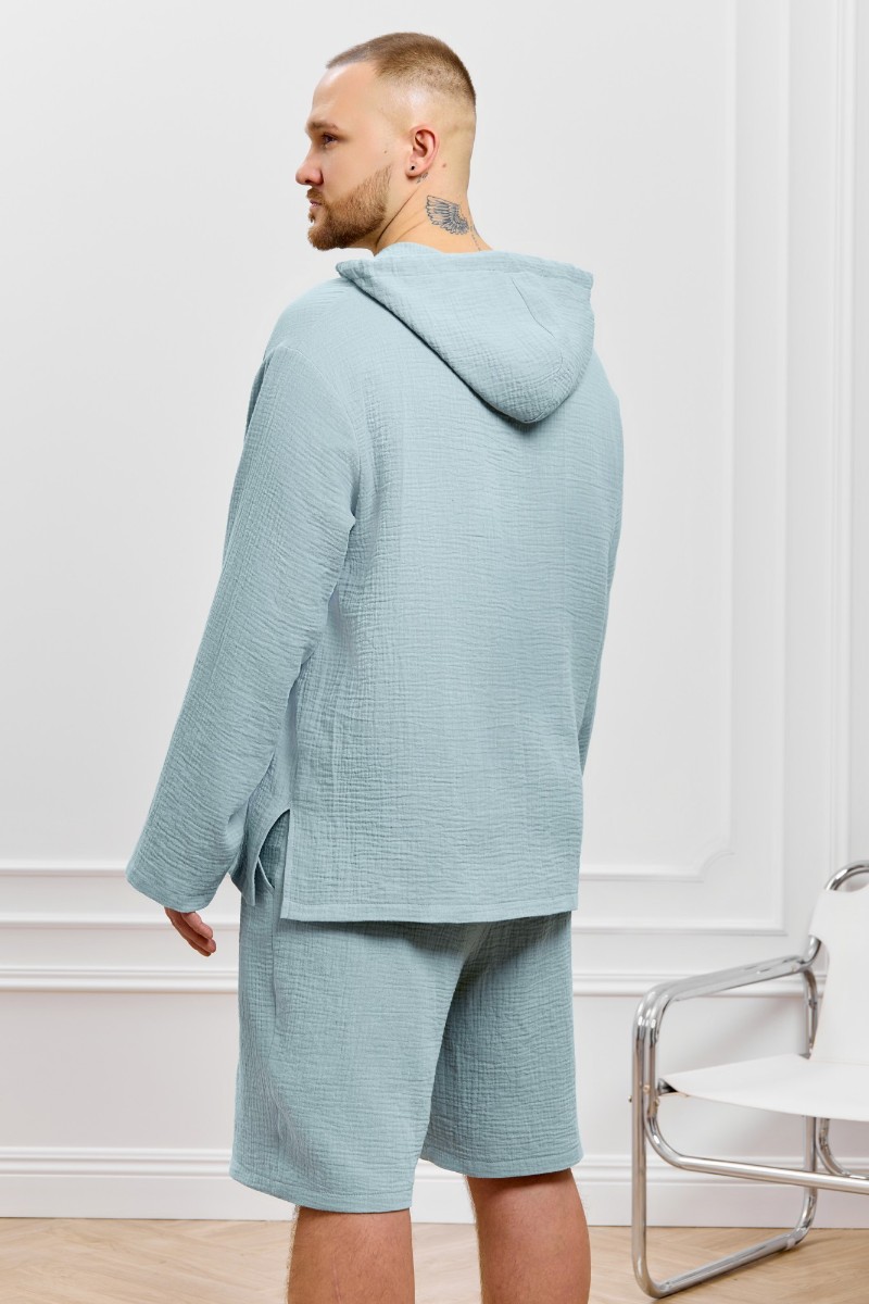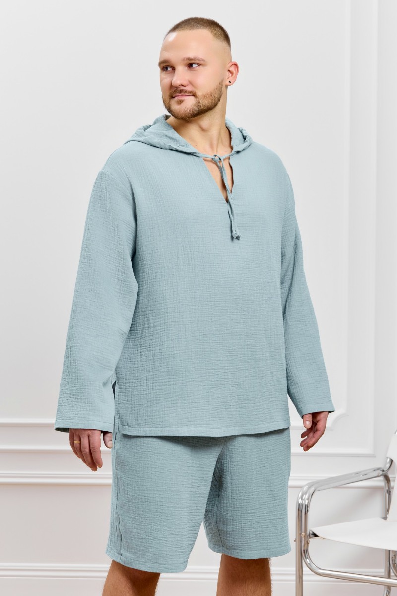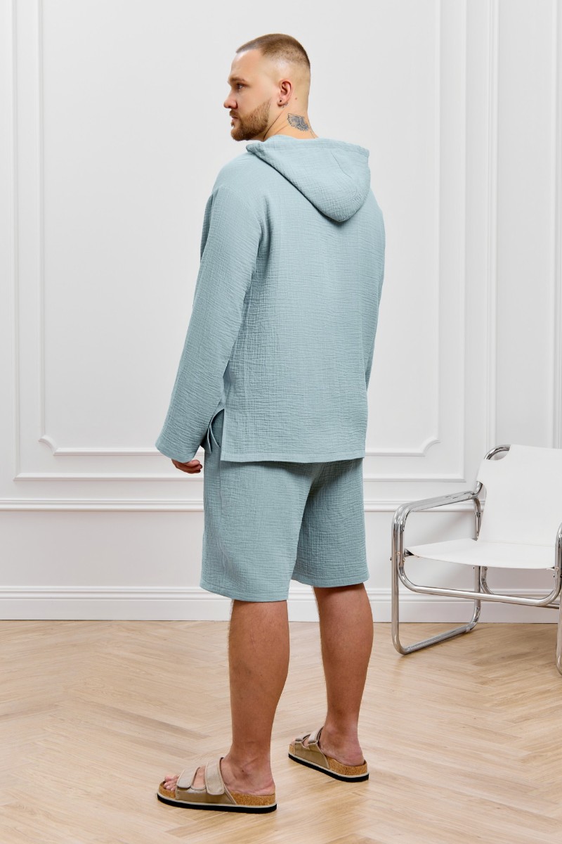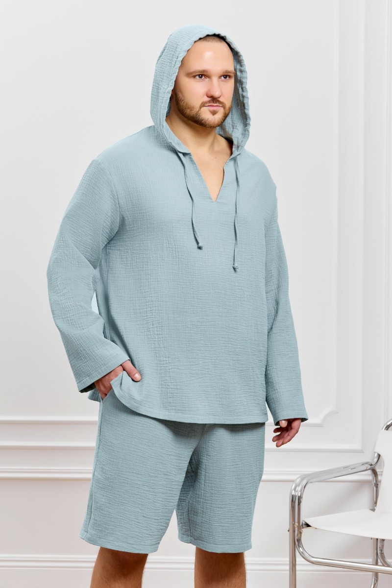 Представляем Вашему вниманию костюм мужской из фактурного гладкокрашеного полотна, состоящий их джемпера и брюк. Джемпер - с капюшоном, длинными втачными рукавами и V-образным вырезом горловины спереди. В шве подгибки переднего края капюшона вставлен шнурок из основного материала. Нижние срезы рукавов и низ изделия обработаны подгибкой. Шорты - классического покроя, на притачном поясе с эластичной тесьмой внутри, с карманами в боковых швах. Нижние срезы обработаны подгибкой.
