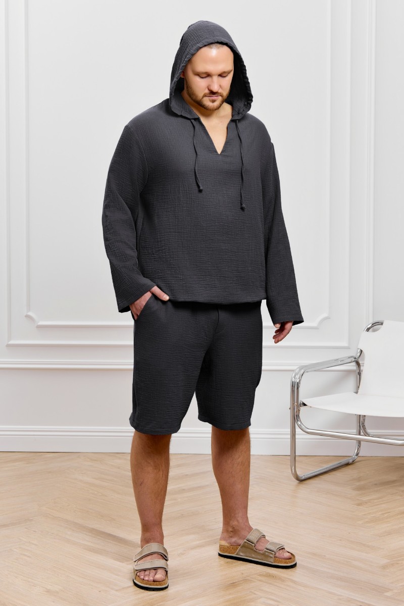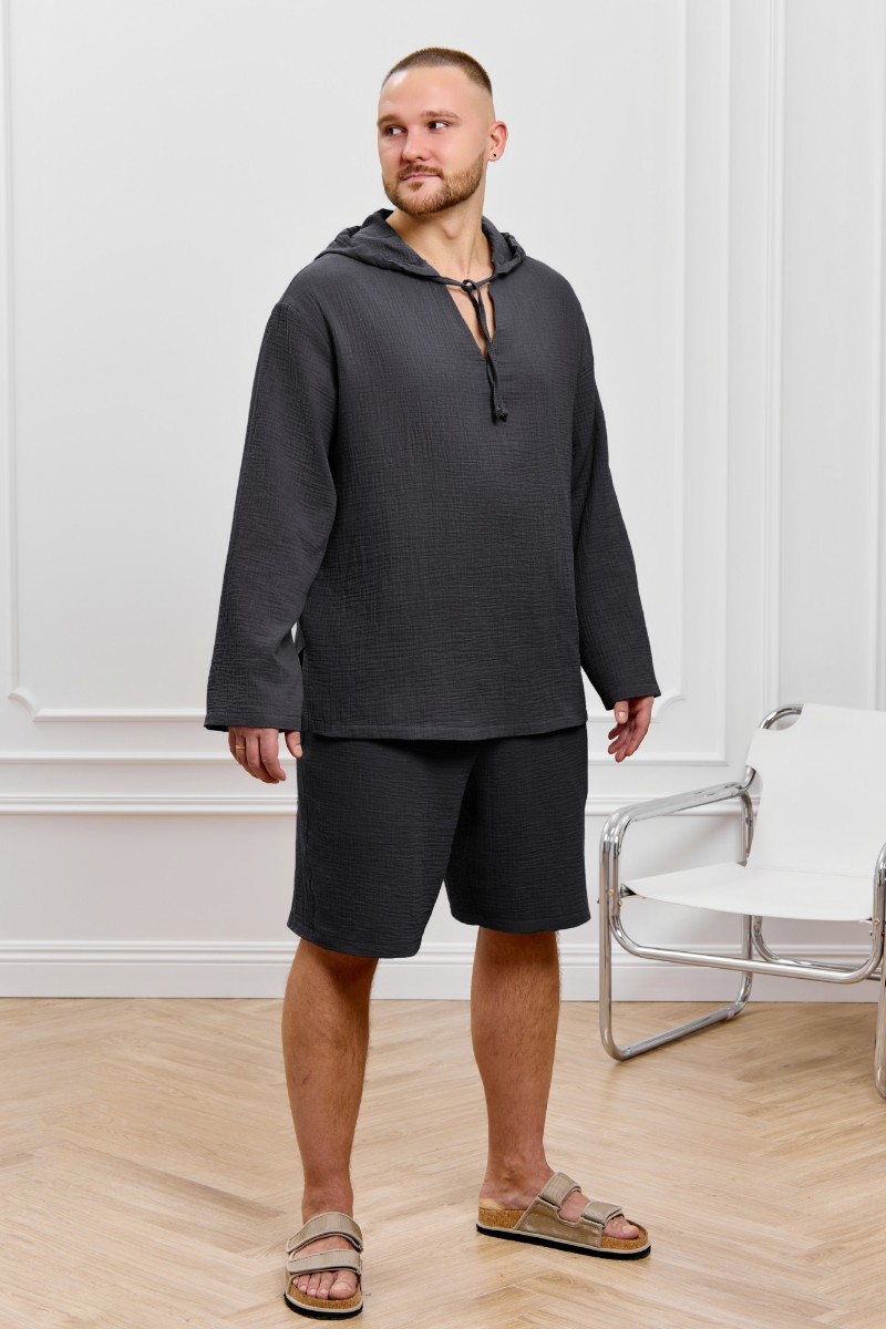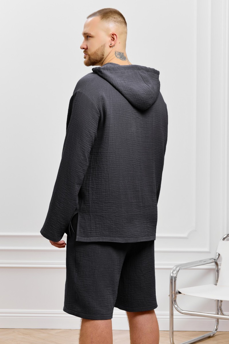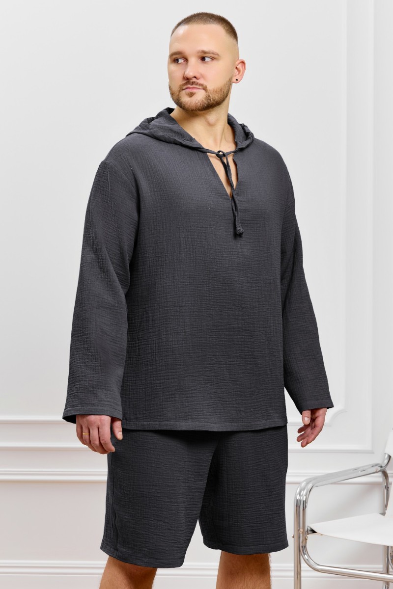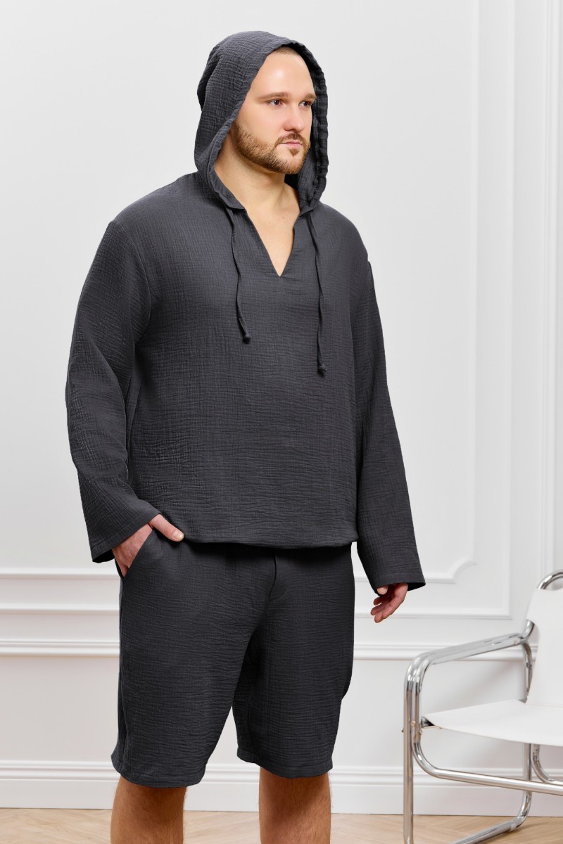 Представляем Вашему вниманию костюм мужской из фактурного гладкокрашеного полотна, состоящий их джемпера и брюк. Джемпер - с капюшоном, длинными втачными рукавами и V-образным вырезом горловины спереди. В шве подгибки переднего края капюшона вставлен шнурок из основного материала. Нижние срезы рукавов и низ изделия обработаны подгибкой. Шорты - классического покроя, на притачном поясе с эластичной тесьмой внутри, с карманами в боковых швах. Нижние срезы обработаны подгибкой.