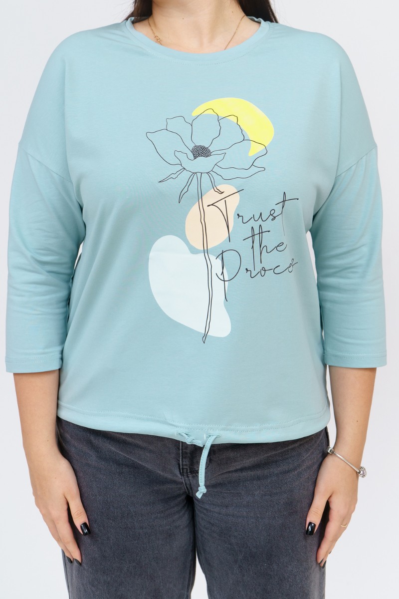 Представляем Вашему вниманию изящный женский лонгслив прямого силуэта со спущенным плечом, рукав втачной, длиной 3/4. Полочка лонгслива украшена принтом. По низу изделия - кулиска. Расцветка красиво смотрится и поднимает настроение. В нём Вы будете чувствовать себя комфортно и уверенно.