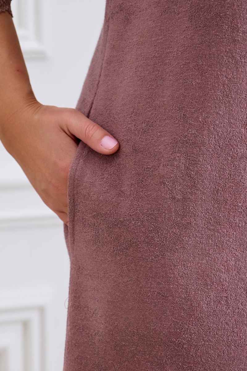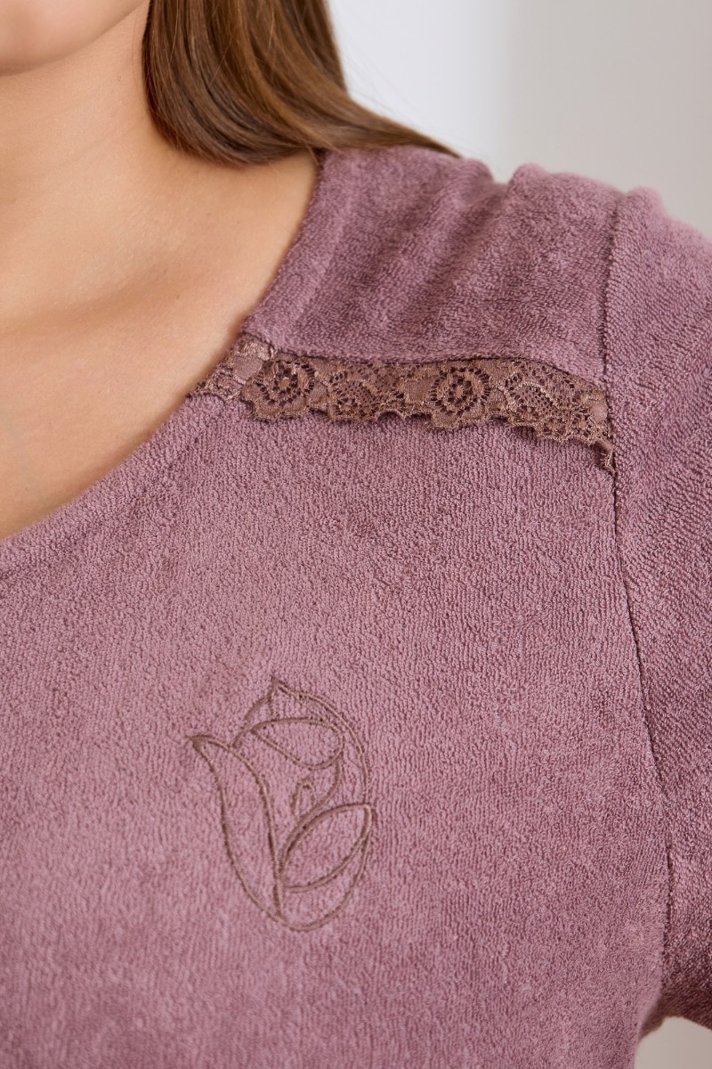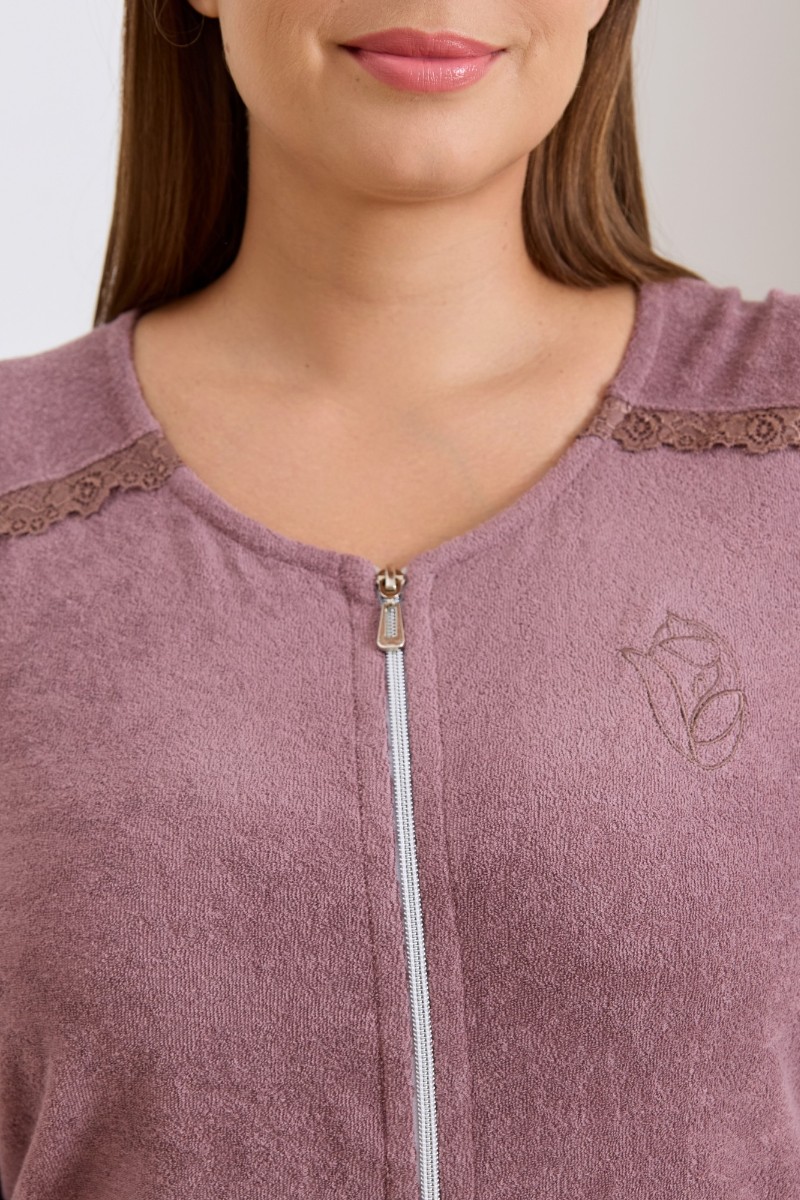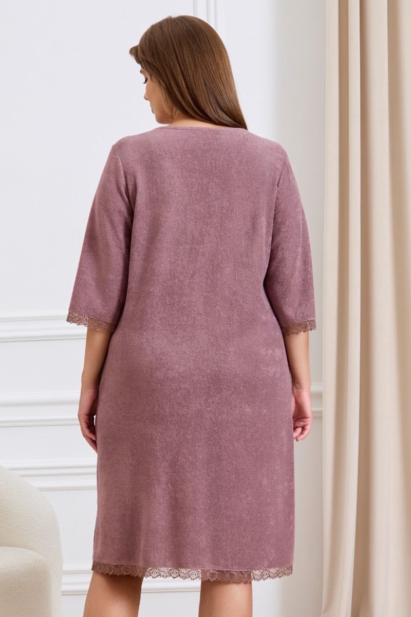 Представляем Вашему вниманию халат женский из гладкокрашенного трикотажного махрового полотна, прямого силуэта, с горловиной овальной формы, втачными рукавами длиной ¾ длины, карманами в боковых швах и центральной бортовой застежкой на тесьму «молния». Полочка – с двумя небольшими косыми кокетками с кружевом в швах соединения кокеток с основными деталями, на левой полочке выполнена вышивка. Нижние срезы рукавов и нижние срезы изделия обработаны кружевом, в боковых швах разрезы.
